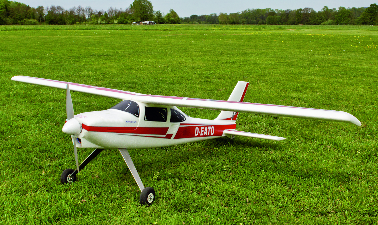 Ein Elektro-Motormodell sollte ein Hochdecker (ist wenn die Tragfläche oberhalb des Rumpfes sitzt) sein und eine Spannweite von etwa 1,3 bis 1,5 m haben. Für den Anfang reicht bei solchen Modellen die Steuerung über Höhen- und Seitenruder aus.