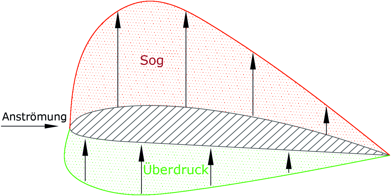 Ein Flugzeug, also auch ein Modellflugzeug, erhält seinen Auftrieb über die Tragfläche. Diese ist so konstruiert, dass die Luft auf der gewölbten Oberseite viel schneller strömt als auf der Unterseite. Dadurch entsteht über dem Flügel ein starker Sog nach oben was somit auf das Modellflugzeug ausübt. Gleichzeitig entsteht auf der Unterseite ein Überdruck, der das Flugzeug nach oben drückt. Spannenderweise ist die Kraft die vom Sog kommt mehr als doppelt so groß wie die von der Druckseite. Unterschiedliche Profilformen (Profil = Längsschnitt durch die Tragfläche) ergeben unterschiedliche Steigwerte, aber auch unterschiedliche Fluggeschwindigkeiten.