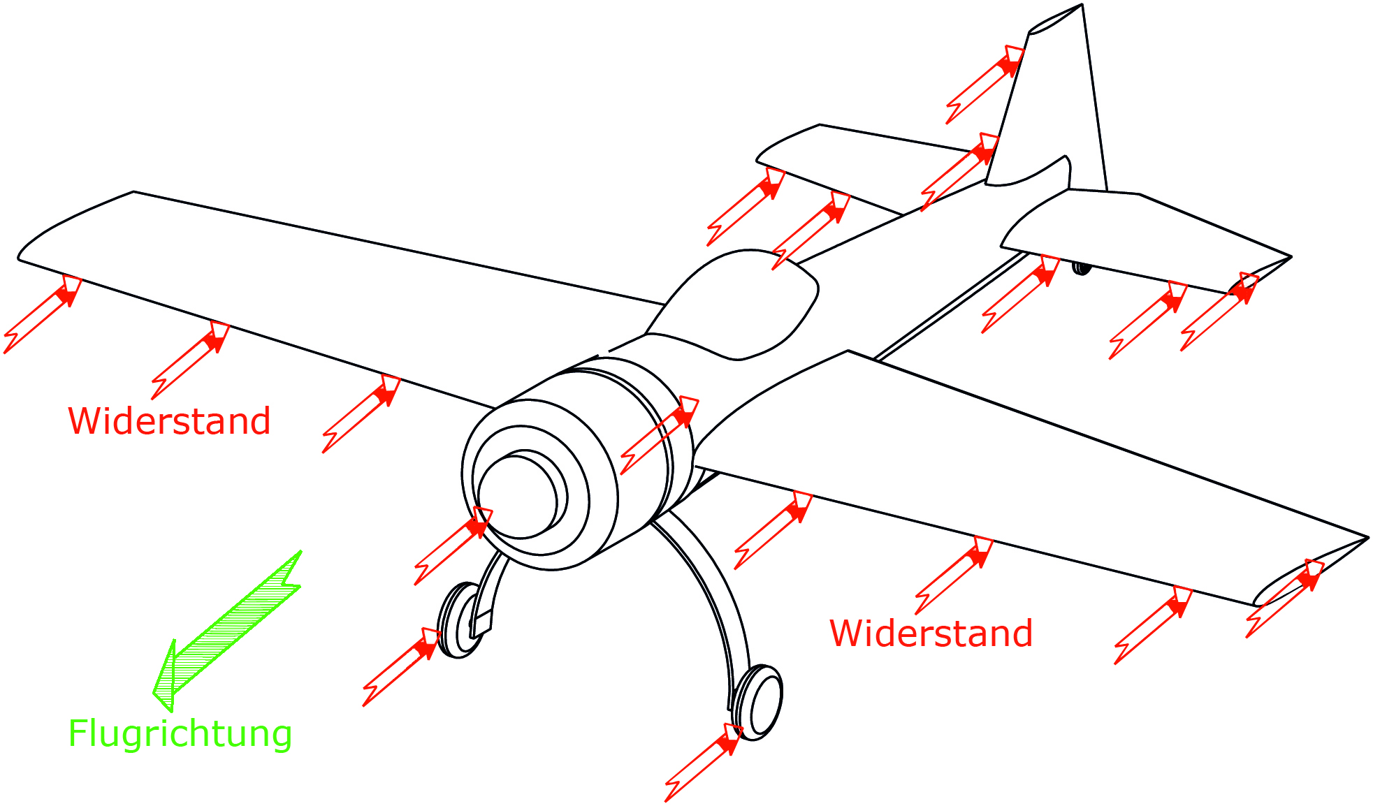 Jedes Tragflächenprofil erzeugt auch einen individuellen Luftwiderstand. Ein Flugzeug wird von diesem Profil-Widerstand abgebremst, bzw. muss eine genügend große Kraft dagegen aufbringen. Der zweite ist der Stirnwiderstand. Dieser wird von allen Teilen des Flugzeugs erzeugt, die sich der Luft in den Weg stellen (z.B. Rumpf, Leitwerke, Fahrwerk, Streben…) Bei aerodynamisch gut optimierten Flugzeugen ist der größte Widerstand der so genannte Interferenz-Widerstand. Dieser entsteht an den Flügelenden, durch das Bestreben der Luft von der Tragflächenunterseite auf die mit dünnerer Luft umgebene Tragflächenoberseite zufließen. So entsteht der so genannte Randwirbel.