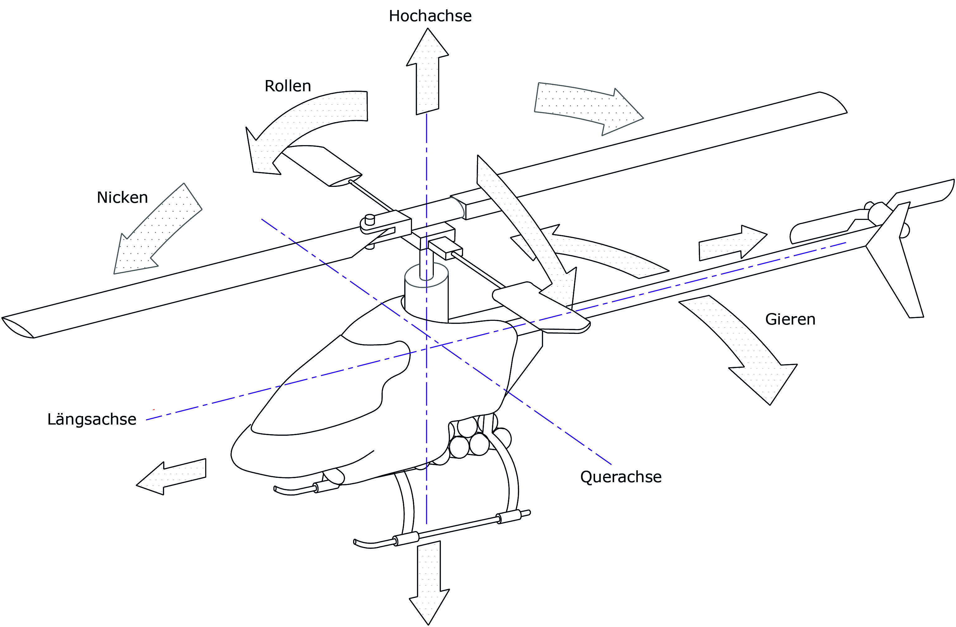 Was beim Flächenflugzeug das Seitenruder ist, ist beim Helikopter der Heckrotor. Durch Veränderung der Drehzahl oder des Anstellwinkels (verändert den Schub) der Heckrotorblätter wird der Helikopter nach rechts oder nach links in Drehung versetzt. Man nennt diese Funktion beim Hubschrauber gieren. Die Wirkung von Höhen- und Querruder erzeugt der Hubschrauber durch Veränderungen in der Hauptrotorebene. Die Rotorblätter erfahren im Laufe ihrer Umdrehungen immer dann wenn sie hinten sind, einen größeren Anstell winkel, was den Hubschrauber nach vorne kippen lässt. Und umgekehrt. Beim Hubschrauber nennt man diese Funktion nicken.
