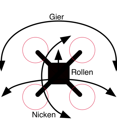 Für Drehungen in der Längsachse (Rollen) werden jeweils die Propeller auf der rechten oder linken Seite in der Drehzahl verändert und für Drehungen in der Querachse (Nick) jeweils die vorderen oder hinteren Propeller. Gesteuert werden diese Drehzahländerungen durch den Controller welcher die Befehle von der Fernsteuerung auf die vier oder mehr Motoren umsetzt.