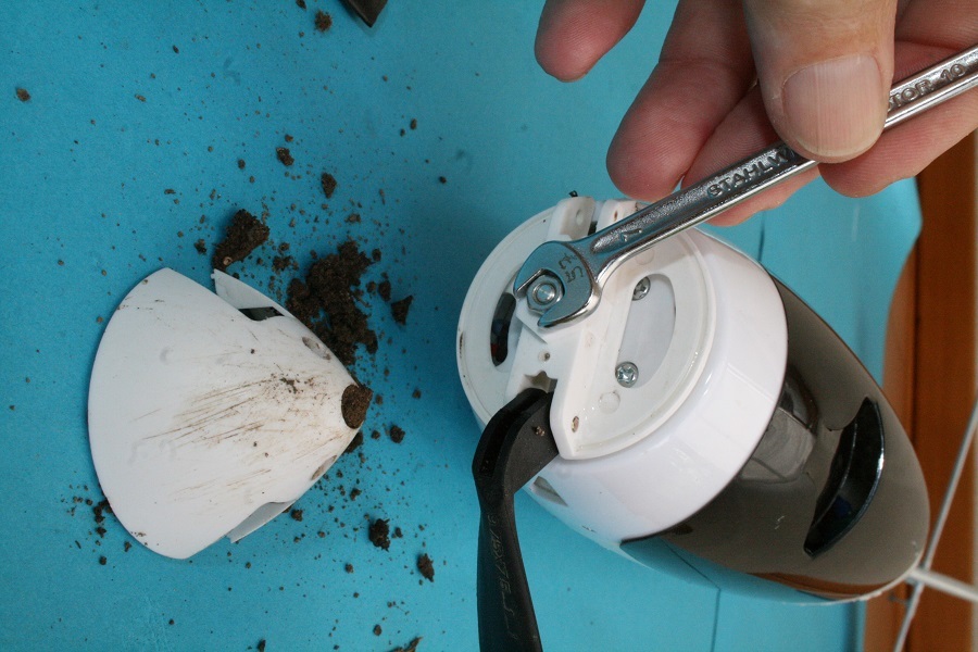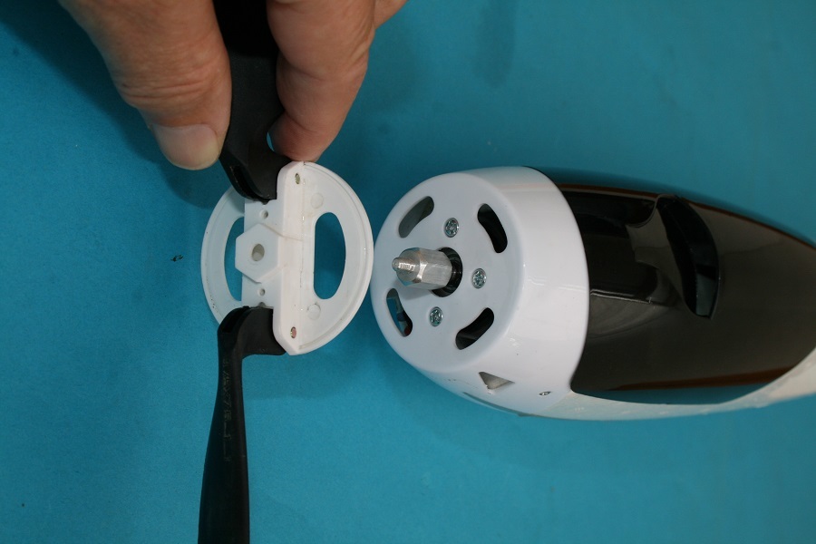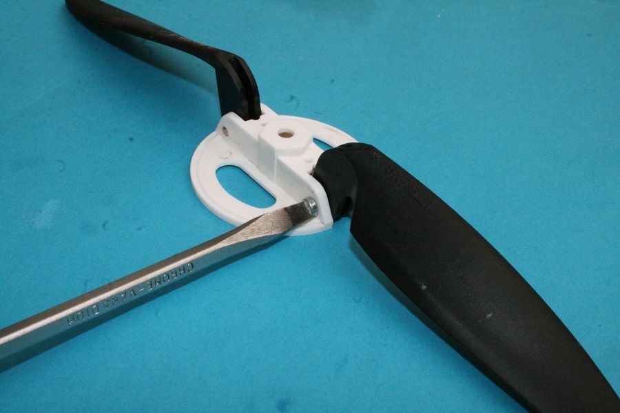 Alle Teile der Klappluftschraube werden nun gründlich gereinigt. Das kann auch unter fließendem Wasser geschehen. Die Befestigungsschraube des beschädigten Luftschraubenblattes wird herausgedreht und der Rest, hier die Blattwurzel, heraus genommen.