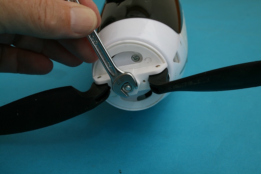 Das neue Luftschraubenblatt wird eingesetzt und die Befestigungsschraube wieder eingedreht. Dabei ist darauf zu achten, dass das Luftschraubenblatt sich leicht bewegen lässt, damit es sich später im Flugbetrieb wieder einwandfrei anklappen kann.