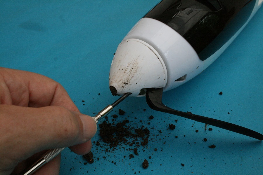 Zunächst wird die Rumpfspitze vom gröbsten Schmutz befreit. Dabei ist besonders darauf zu achten, dass keine Schmutzpartikel in den Motor gelangen. Dann lösen wir die Befestigungsschrauben der Spinnerkappe.
