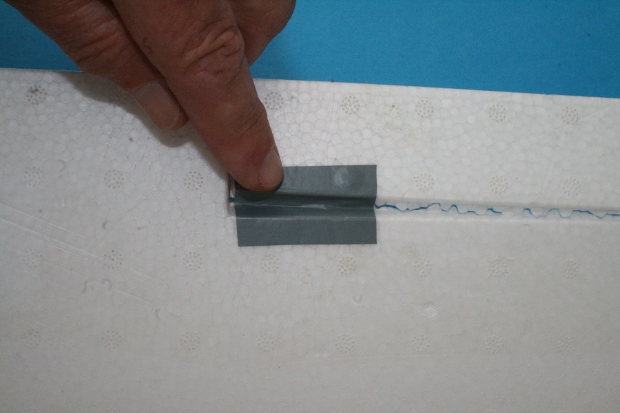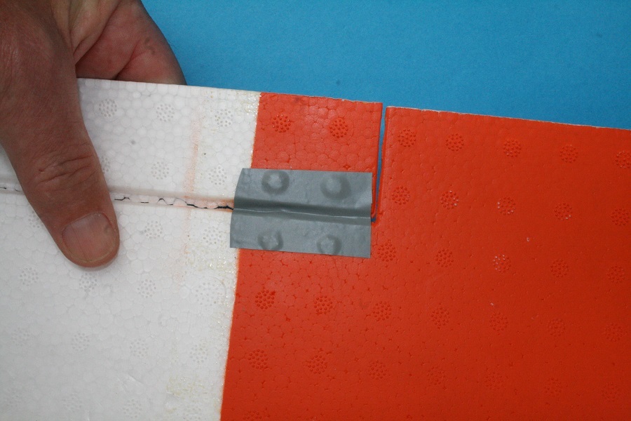 Das Querruder wird bis zum Anschlag nach unten gedrückt und gleichzeitig fest an die Tragfläche gepresst, sodass kein Spalt dazwischen entstehen kann. In dieser Stellung wird ein Stück Klebeband aufgelegt – noch nicht fest andrücken! Zuerst wird das Klebeband in die Vertiefung zwischen Tragfläche und Querruder gedrückt und an den Seiten des Schlitzes angerieben. Anschließend wird es auf der Oberseite von Tragfläche und Querruder angerieben.