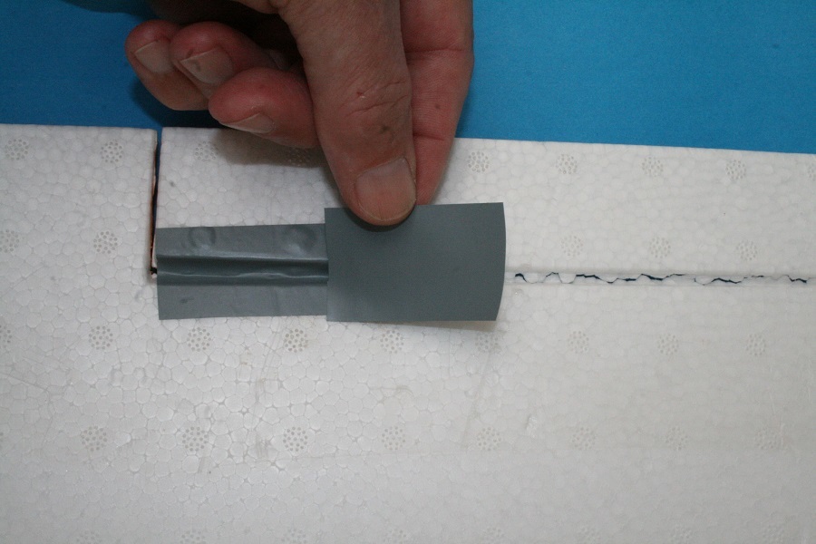 Mit einem weiteren Stück Klebeband verfahren wir in gleicher Weise. Dies wiederholen wir so oft, bis der abgerissene Teil des Querruderscharniers vollständig ersetzt ist.