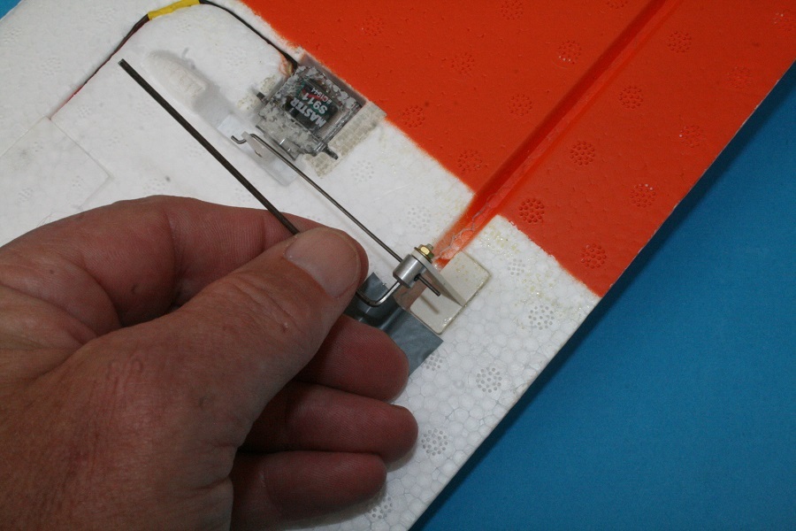 Anschließend wird der Anlenkdraht wieder am Ruderhorn angeschlossen. Dabei müssen wir auch die korrekte Neutralstellung des Ruders achten. Also zuerst die RC-Anlage (Sender und Modell) einschalten. Das Querruderservo steht in Neutralstellung, solange der Kreuzknüppel am Sender nicht bewegt wird. Nun wird das Ruder in Neutralstellung gehalten und der Gestängeanschluss fest angezogen.