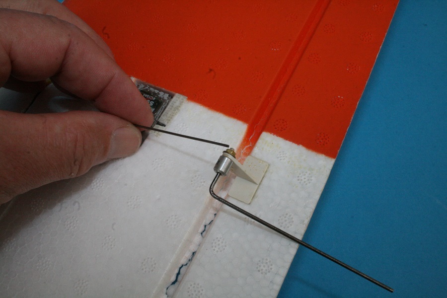 Beim Aufbringen des Klebebandes ist es notwendig, das Querruder in seine maximal möglichen Ausschläge nach oben und unten zu bringen. Deshalb muss der Anlenkdraht vom Ruderhorn getrennt werden. Dazu wird mit dem Inbusschlüssel die Klemmschraube gelöst und der Anlenkdraht aus dem Klemmstück gezogen.