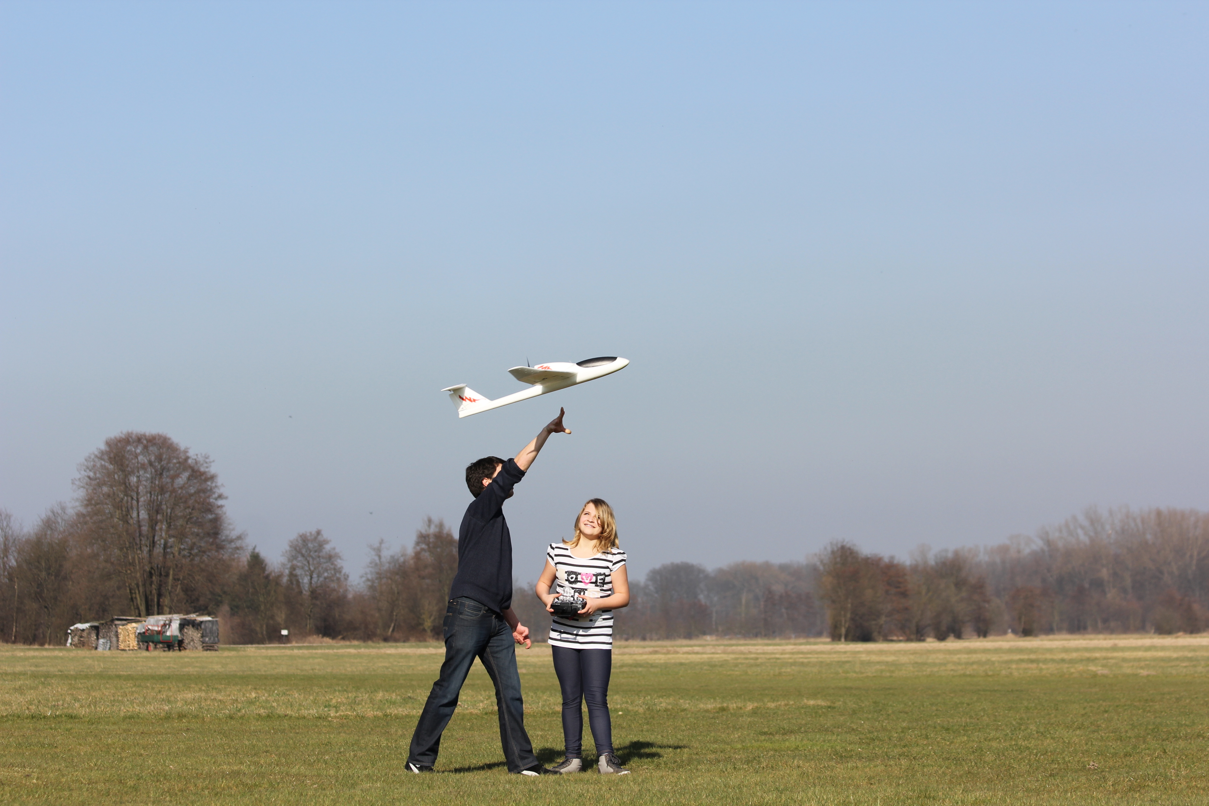 Der Start unseres Motor-Seglers erfolgt durch den Handstart. Dazu wird das Modell am Rumpf etwa im Schwerpunkt gefasst. Wir achten dabei besonders darauf, dass das Modell gerade gehalten wird. Es darf dabei nicht eine Flächenspitze nach unten hängen und weder die Rumpfspitze oder das Leitwerk (bezeichnet alle Bauteile die zur Steuerung dienen) zum Boden gerichtet sein. Jetzt den Motor starten und das Modell mit einem kräftigen Schupps abwerfen.