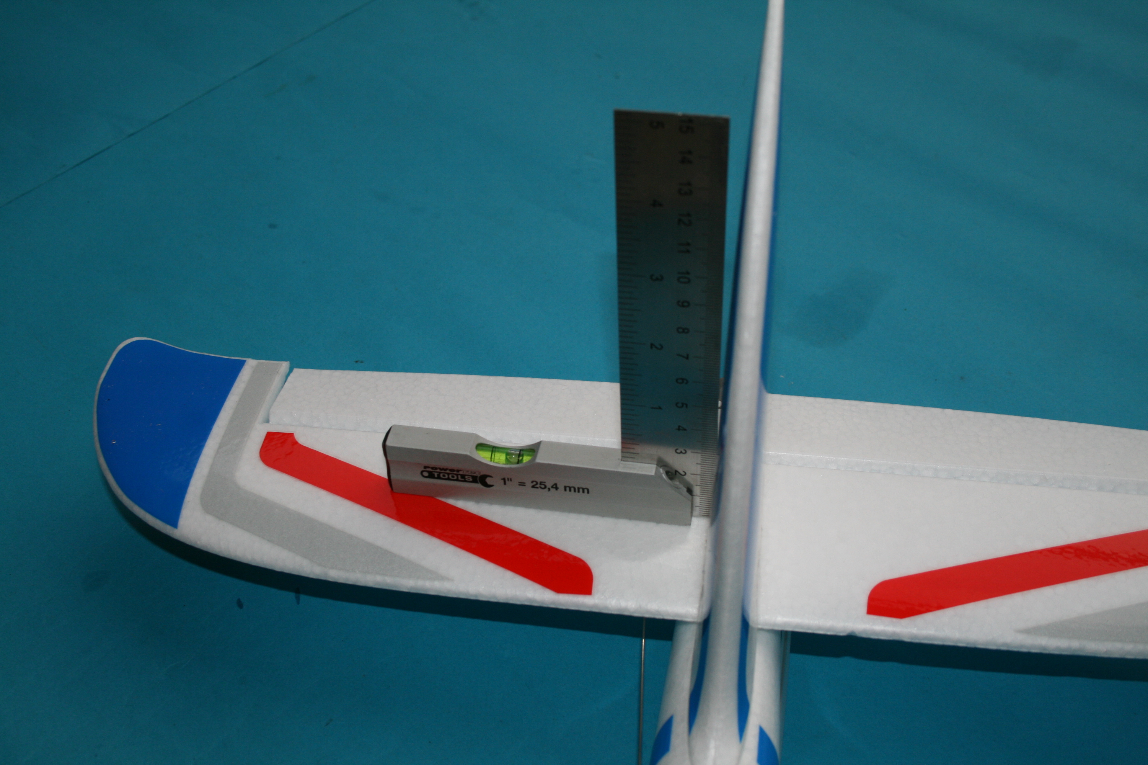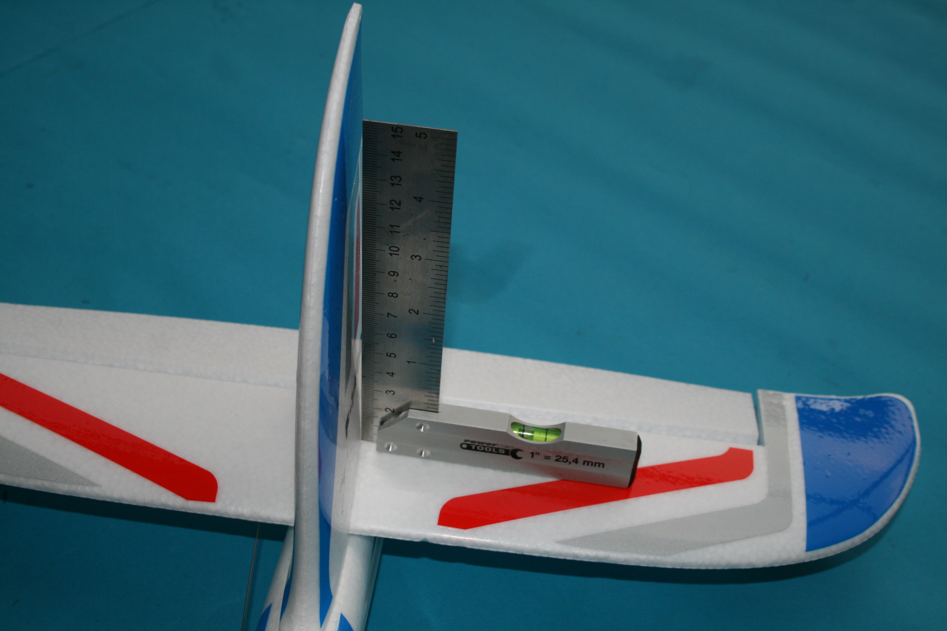 Jetzt wird der Sitz des Seitenleitwerks überprüft. Dazu dieses probehalber ohne Klebstoff in die Aufnahme stecken. Das Seitenleitwerk (ist die senkrechte Leitwerkfläche) muss rechtwinklig zum Höhenleitwerk ausgerichtet sein, hierzu einen Winkel benutzen. Da das Seitenleitwerk nach oben hin konisch zuläuft, muss der Abstand von der Spitze des Leitwerks zum Schenkel des Winkels auf beiden Seiten gleich groß sein. Ist alles in Ordnung, kann das Seitenleitwerk mit dem Rumpf verklebt werden.