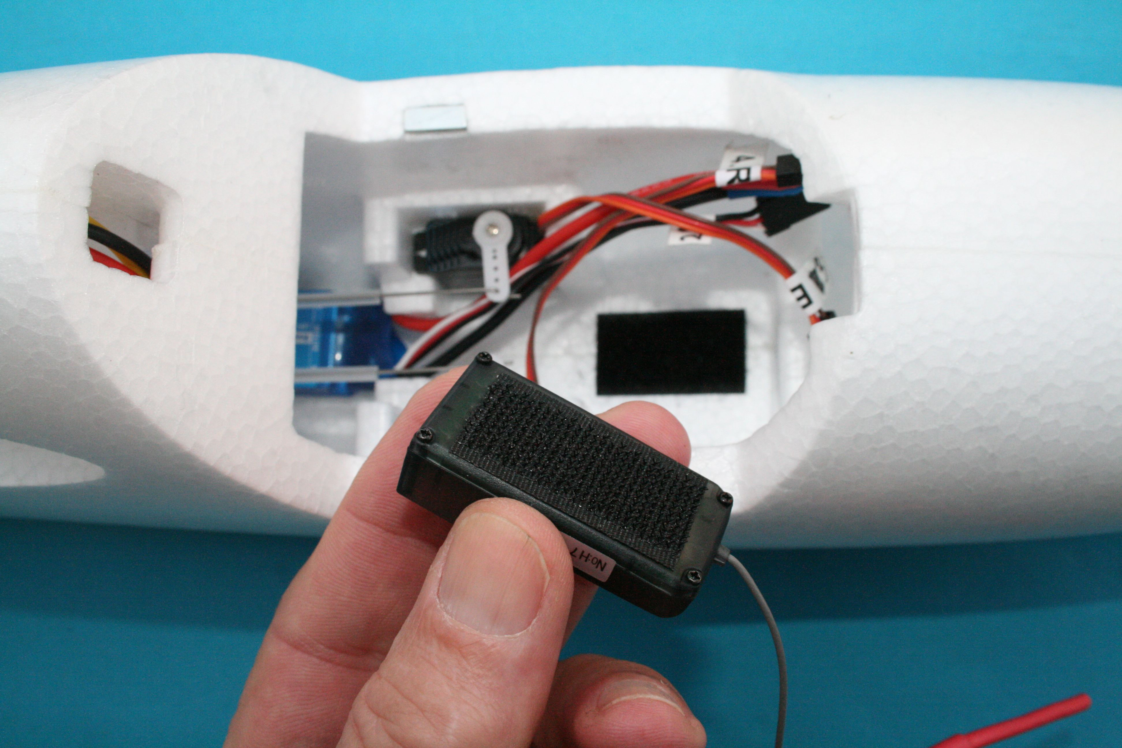 Das Flauschband wird auf den Empfänger, das Hakenband an geeigneter Stelle im Rumpf aufgeklebt. Danach wird der Empfänger einfach auf das Hakenband aufgedrückt, beide Bänder verhaken sich und halten so den Empfänger in Position. Mit dem Regler verfahren wir in derselben Art und Weise.