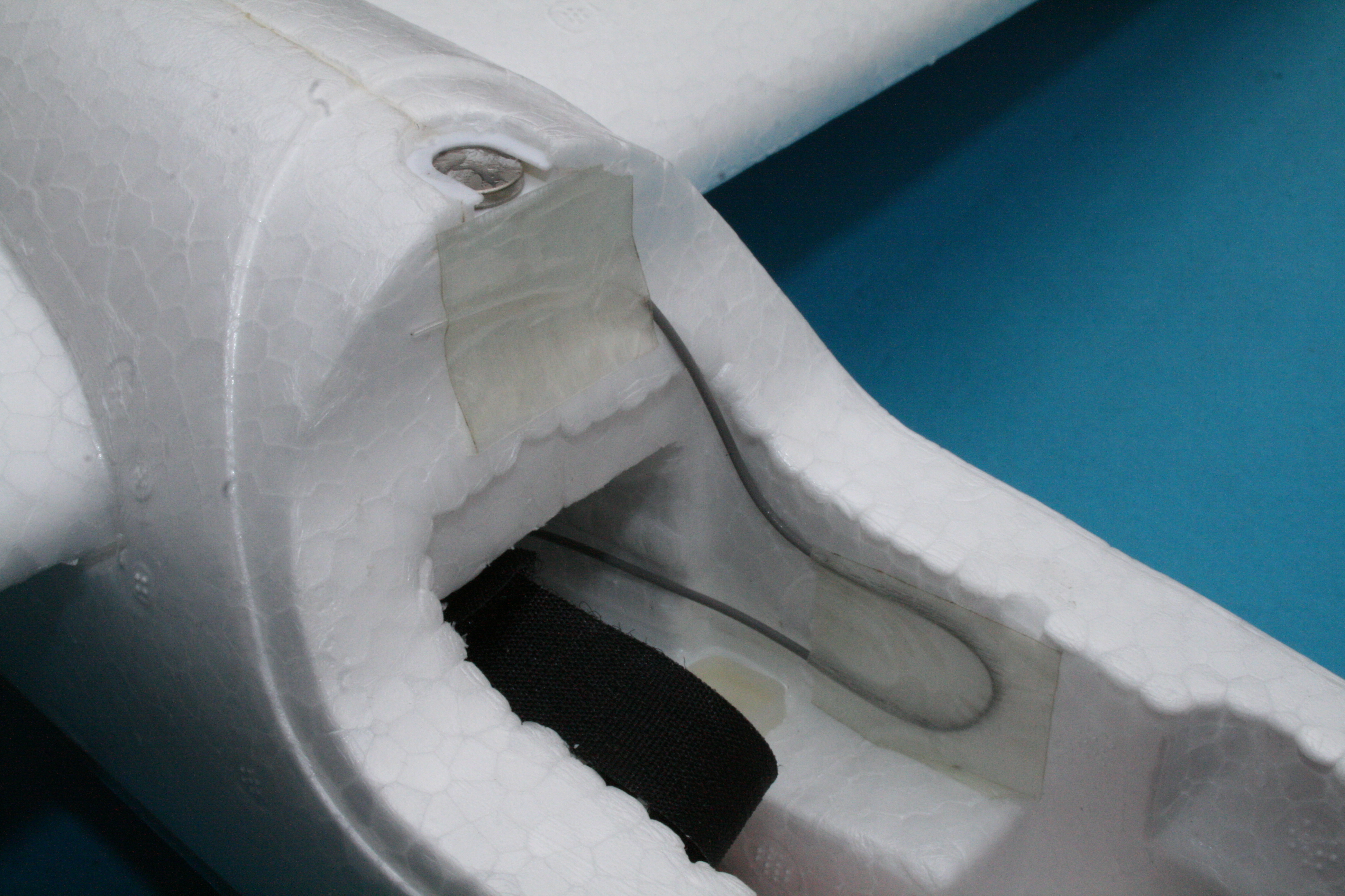 Ist der Empfänger eingebaut, muss noch dessen Antenne so verlegt werden, dass sie nicht mit den sich bewegenden Teilen der Servos in Berührung kommt. Die Antenne wird am besten an der Rumpfinnenseite mit einem Stück Klebeband befestigt.
