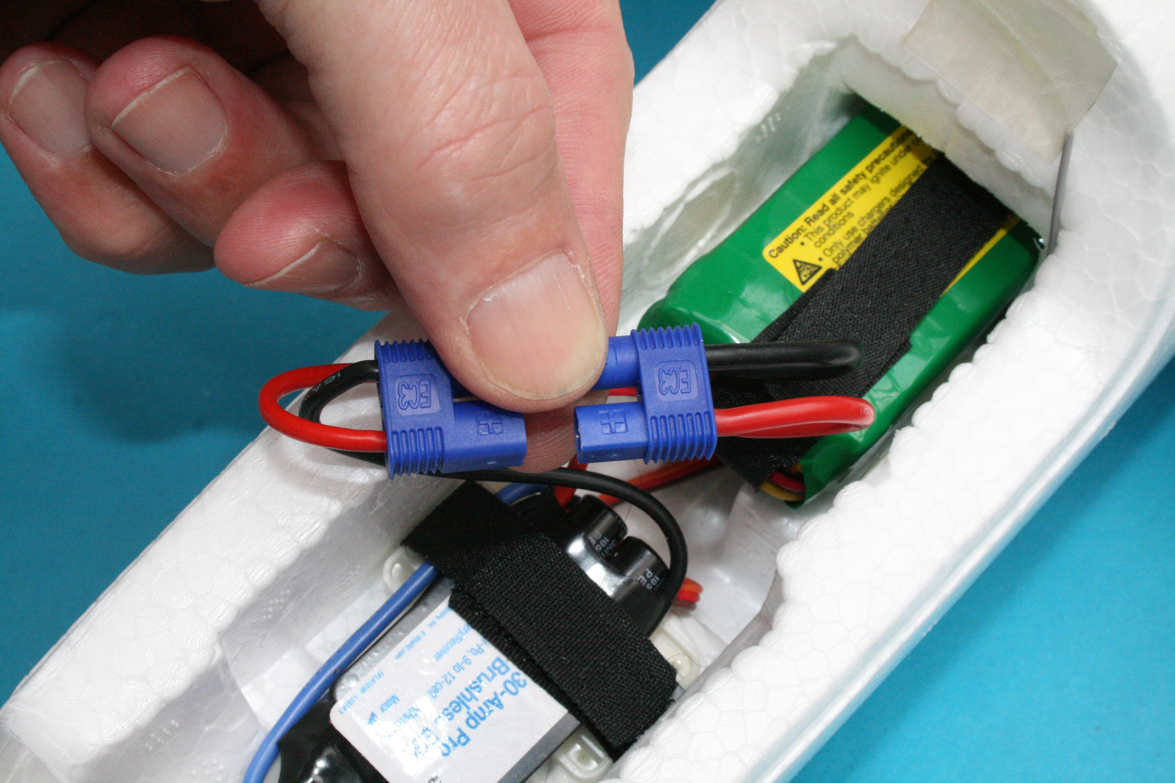 Der Motor bzw. dessen Luftschraube muss richtig herum drehen. Wir schalten jetzt den Sender an, bringen den Gashebel in die Stellung „Aus“ und verbinden die Anschlusskabel des Akkus mit denen des Reglers. Natürlich achten wir dabei darauf, dass sich keine Teile – und dazu gehören auch die Hände! – im Drehkreis der Luftschraube befinden. Für das erste Anlaufen des Motors stellen wir uns hinter das Modell und halten dieses gut fest