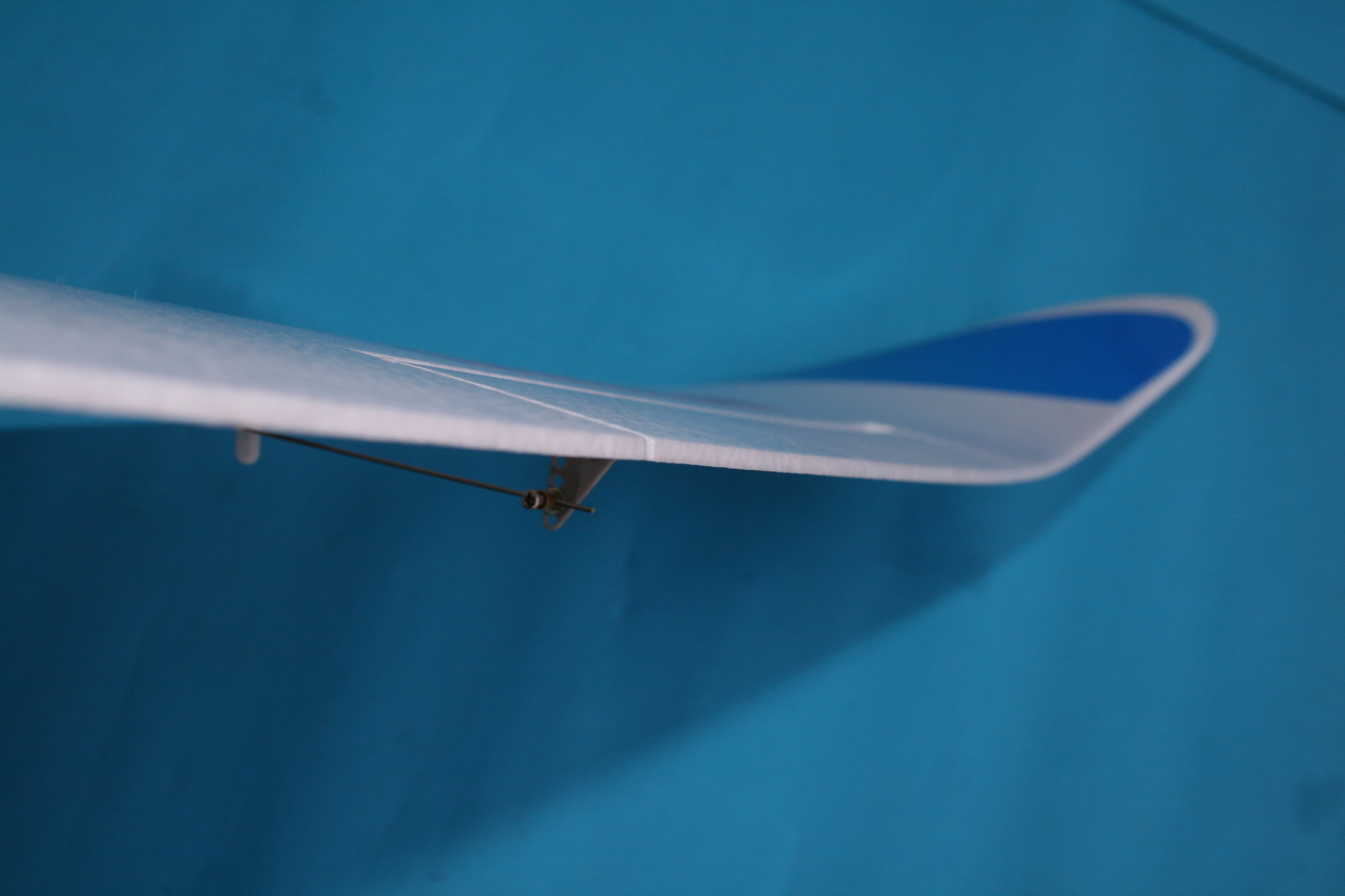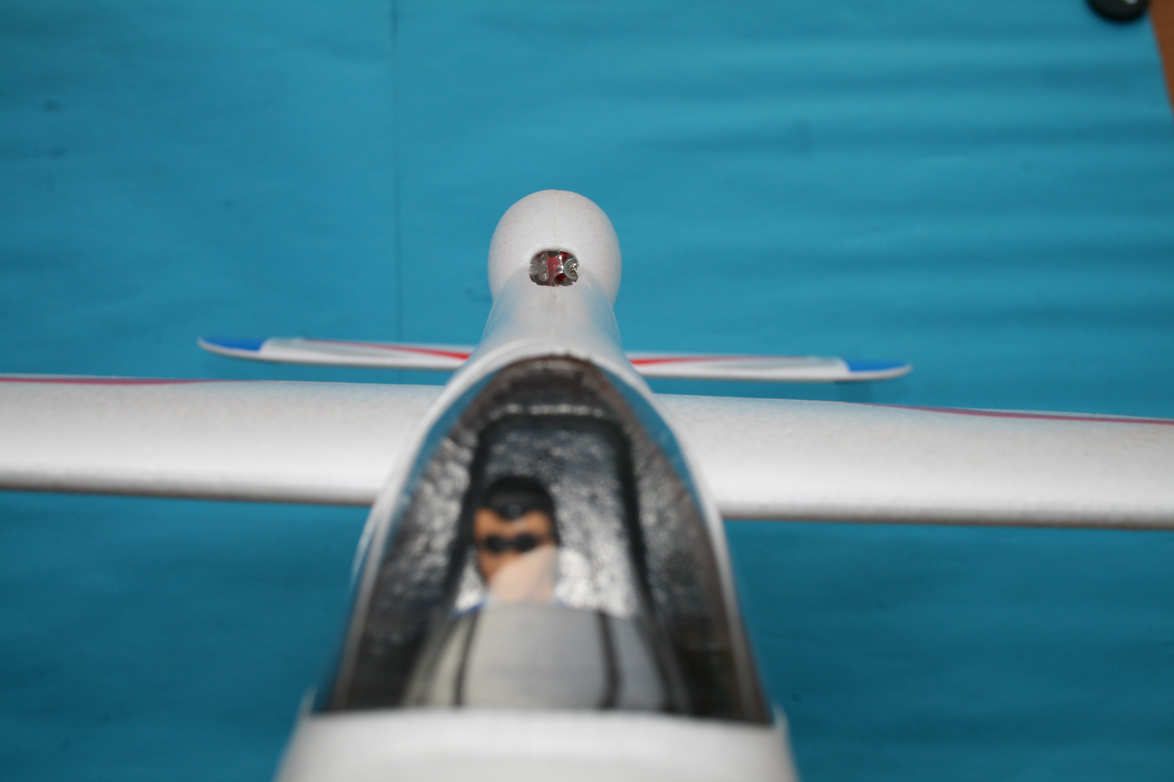 Nun peilen wir über das Modell von vorne und versuchen die Tragfläche mit dem Höhenleitwerk deckungsgleich zu bringen, d.h. die äußeren Spitzen des Höhenleitwerks sollen links und rechts den gleichen Abstand zur Tragfläche haben.