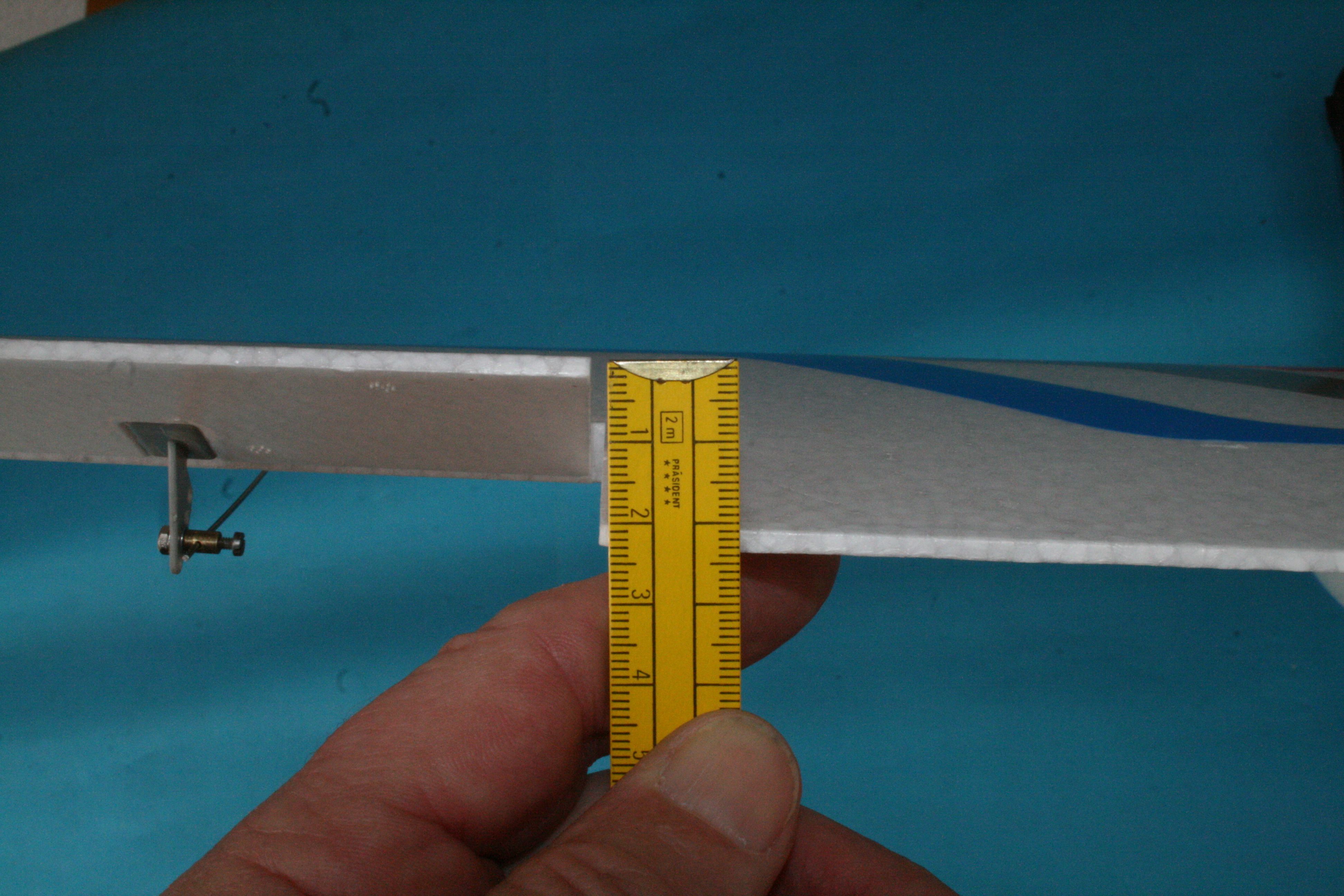 Die mit wichtigste Einstellung an einem Flugmodell ist die korrekte Schwerpunktlage. Die exakte Position entnehmen wir der Bedienungsanleitung des Modells. Das Maß für den Schwerpunkt wird von der Nasenleiste (= Vorderkante) des Tragflügels aus zur Flächenmitte hin abgetragen. Auf der Unterseite der Tragfläche zeichnen wir uns dort unmittelbar neben dem Rumpf eine dünne Linie.