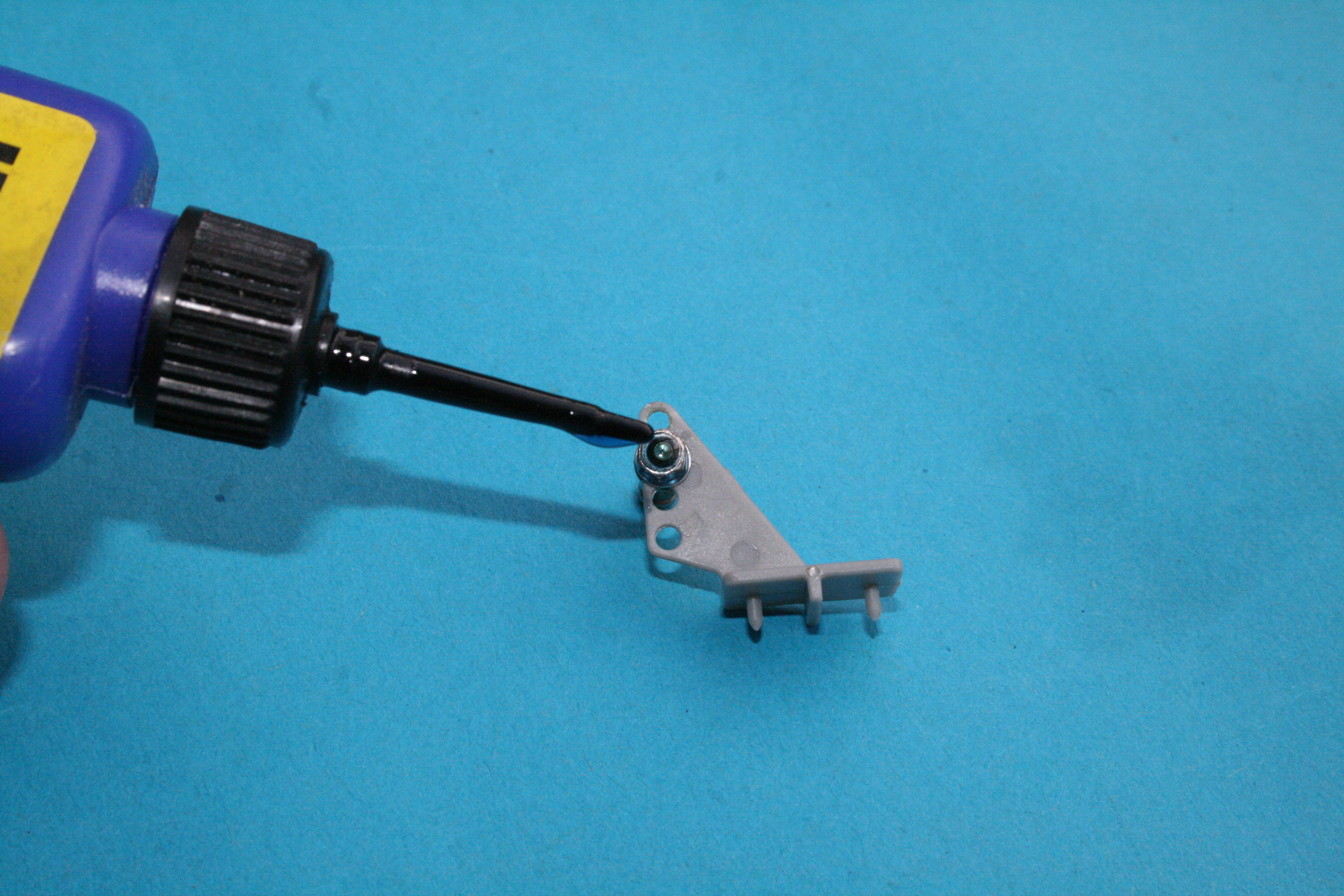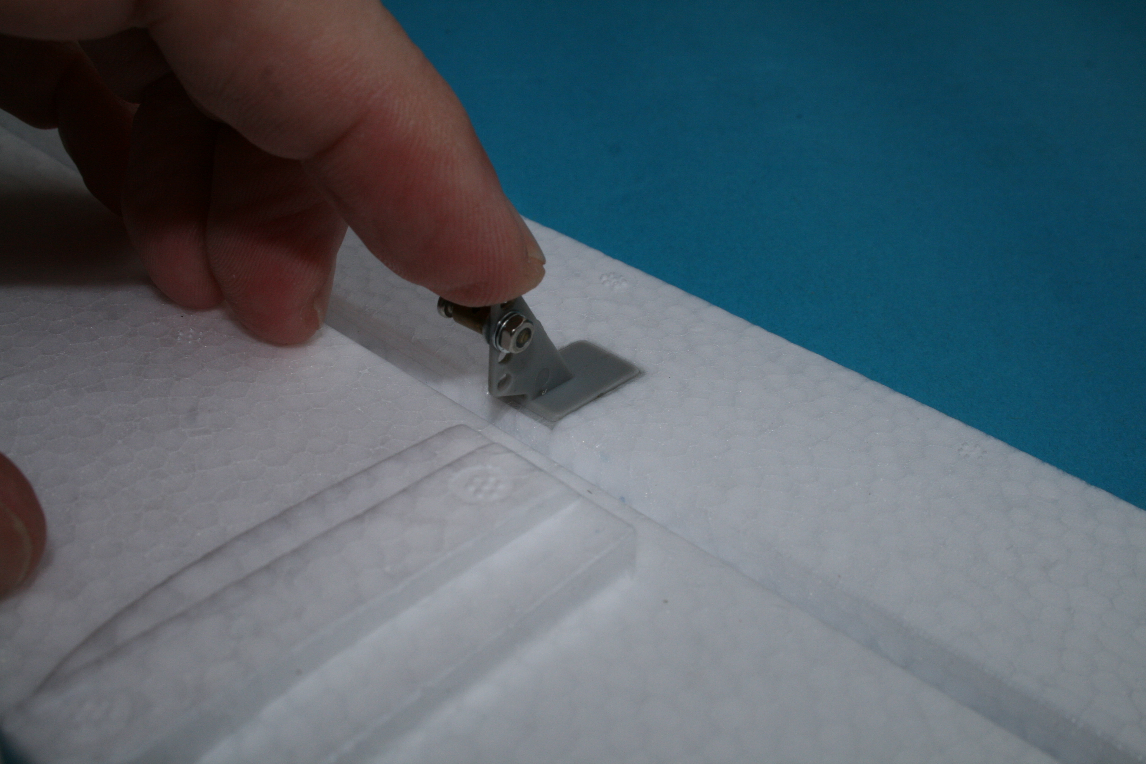 Nun können die Ruderhörner in den Ruderklappen eingeklebt werden. Dazu zwei Tropfen Sekundenkleber in den Aufnahmeschlitz tröpfeln …