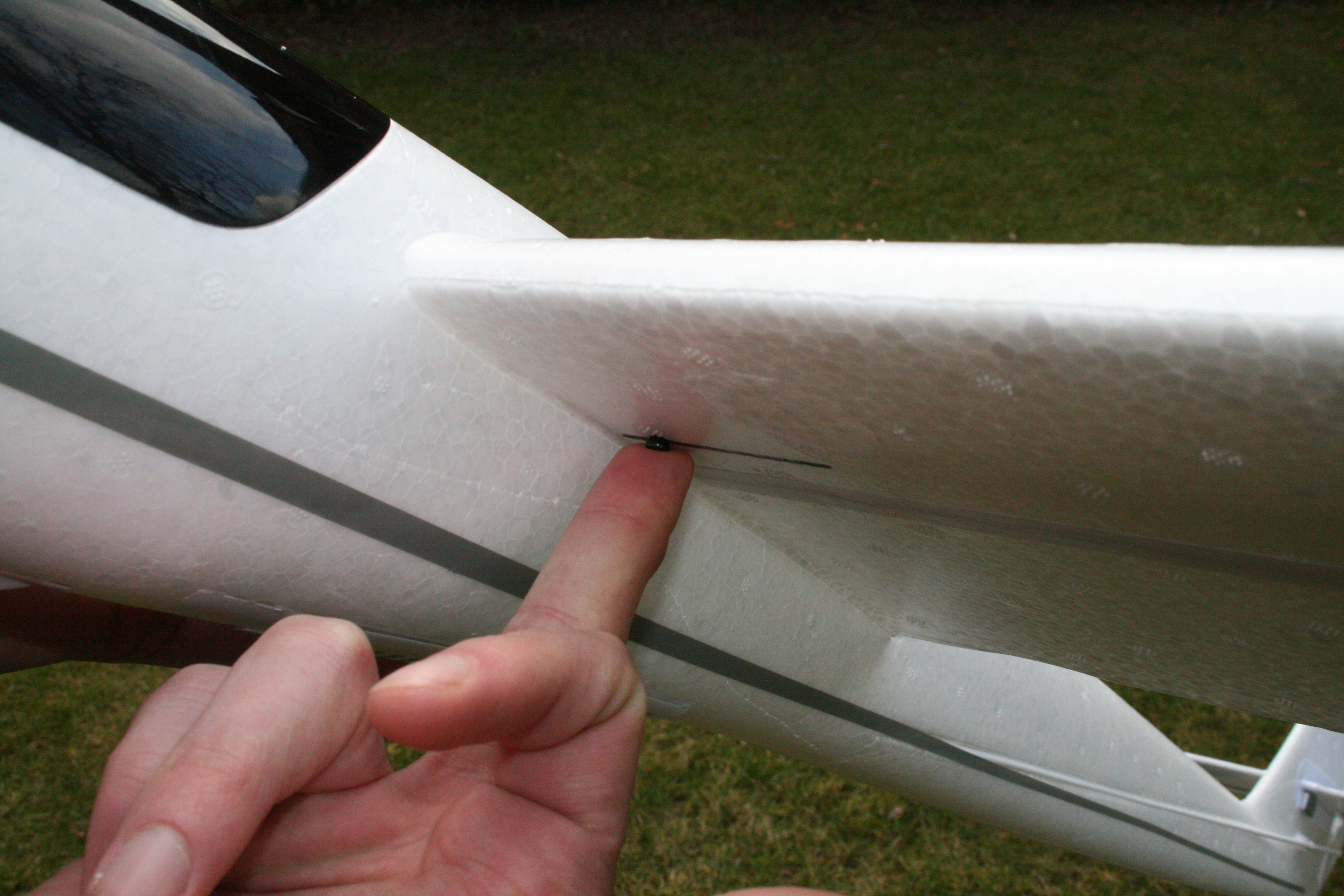 Danach werden die Ruder von Hand in Neutralstellung gebracht. Dabei kann man sich gut an der Hinterkante der Tragfläche bzw. der Leitwerke orientieren
