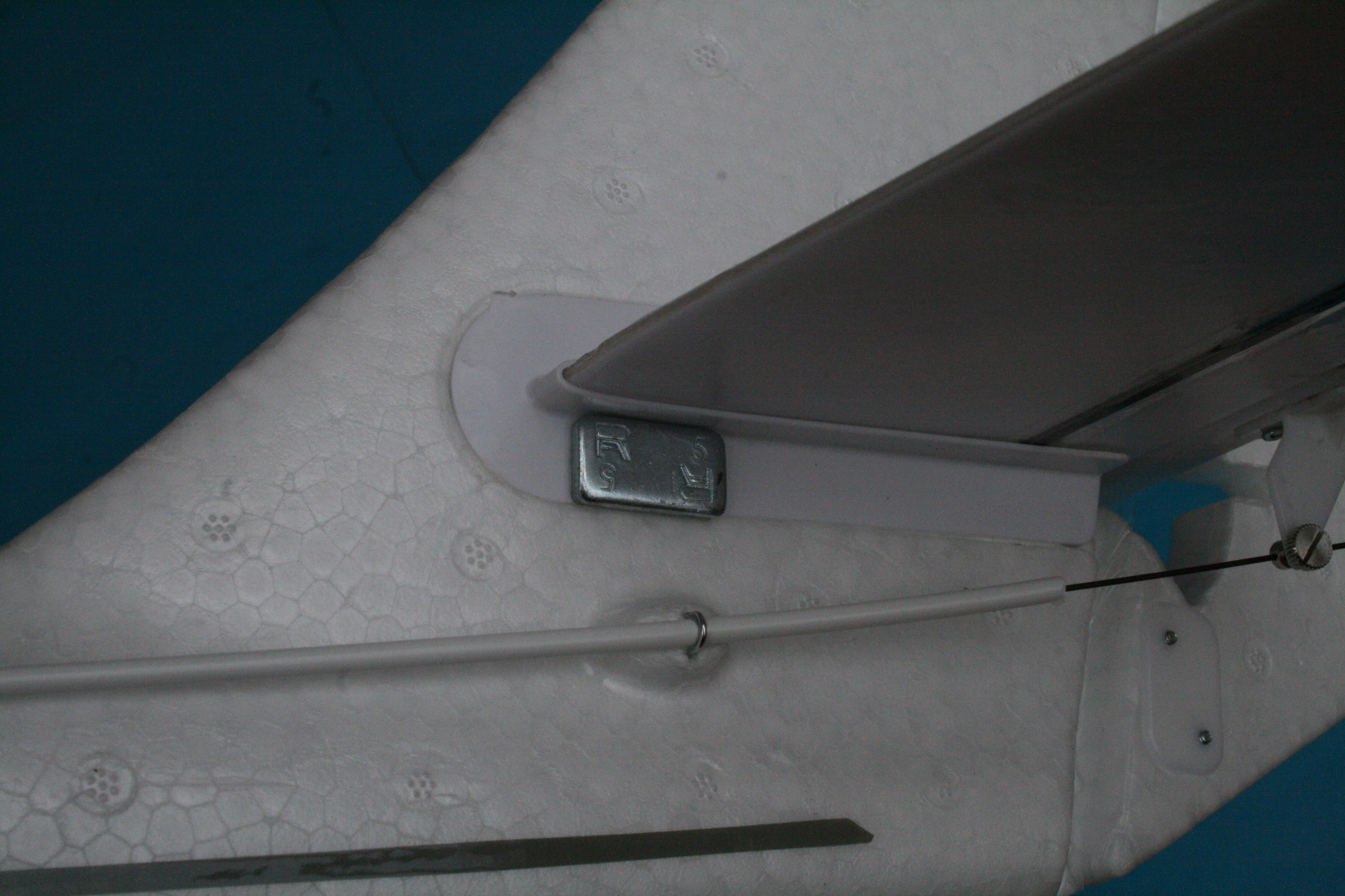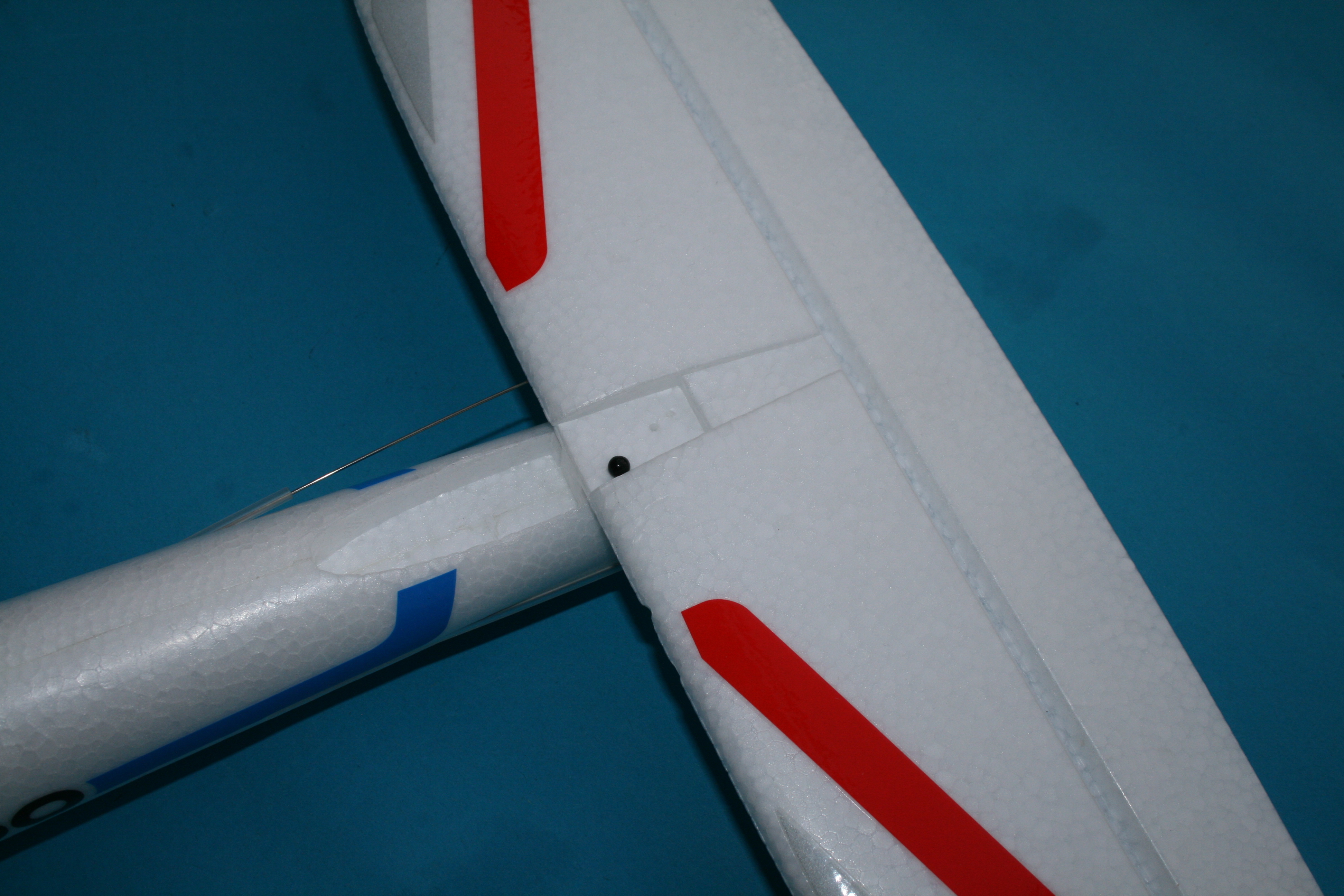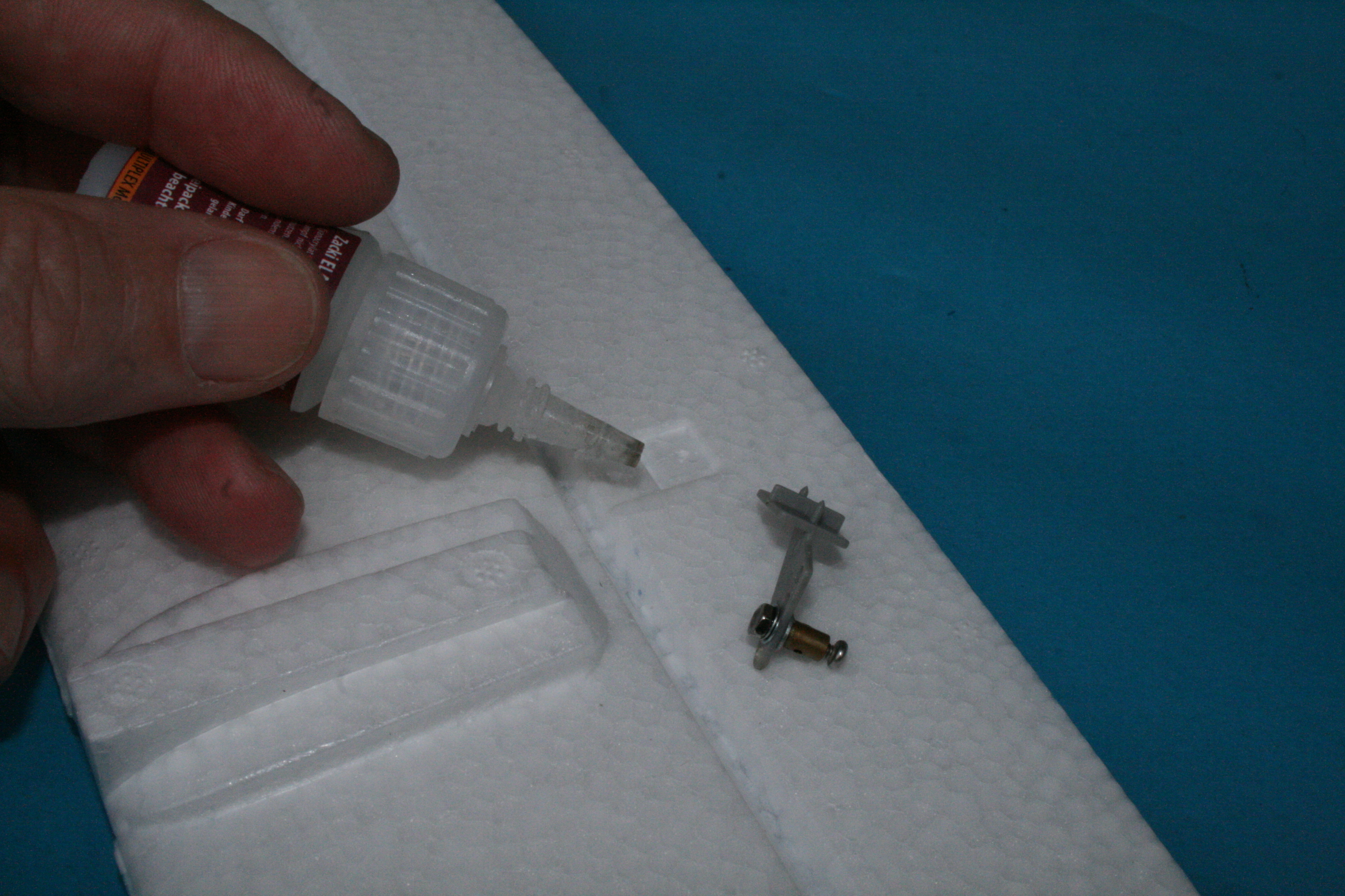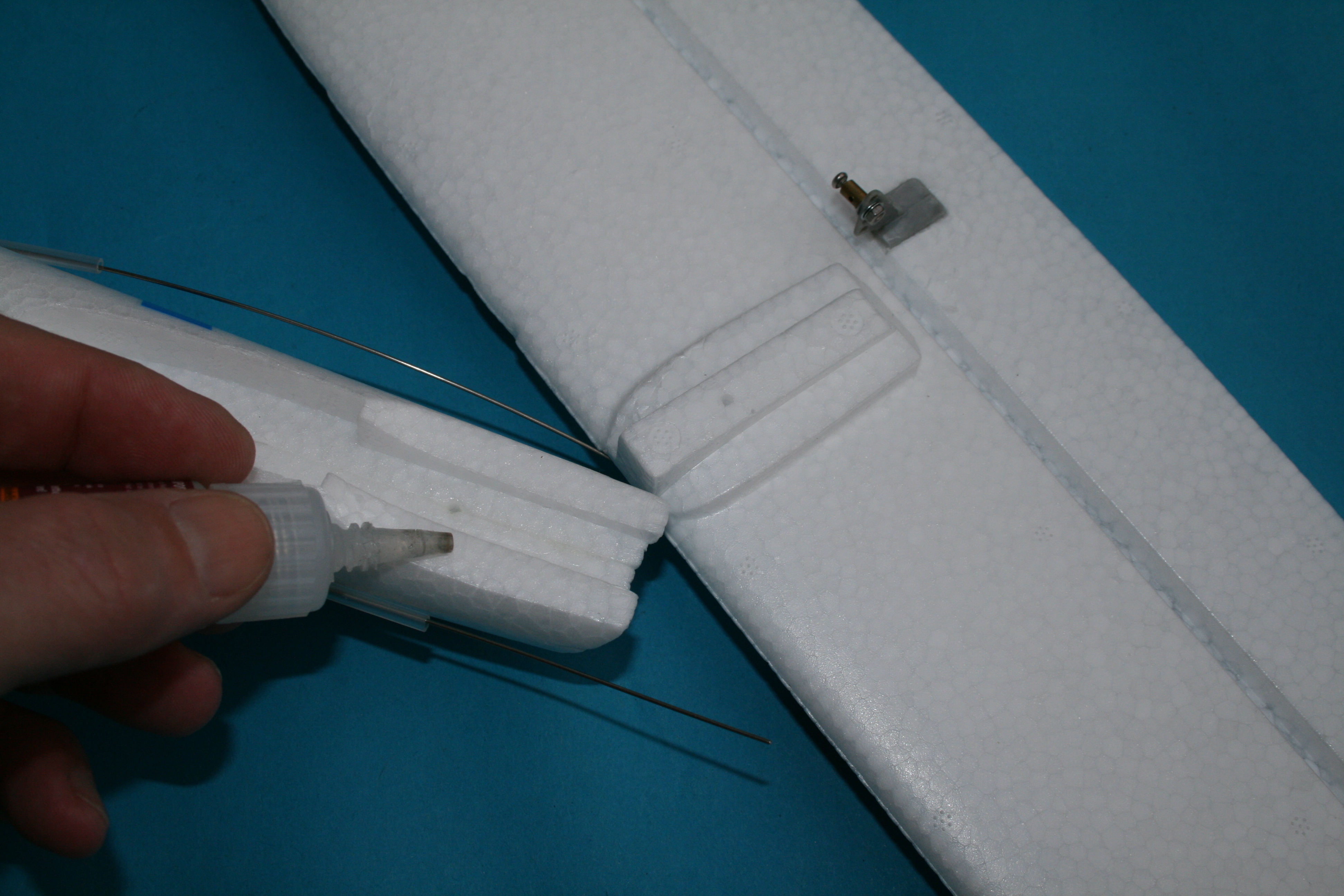 Verläuft diese Prüfung zur Zufriedenheit, so wird das Höhenleitwerk (horizontale Fläche des Leitwerks am Heck eines Flugzeuges) wieder abgenommen, die Auflagefläche am Rumpf dünn mit Sekundenkleber beträufelt und das Höhenleitwerk aufgesetzt. Danach sofort wie bereits beschrieben den korrekten Sitz noch einmal überprüfen.