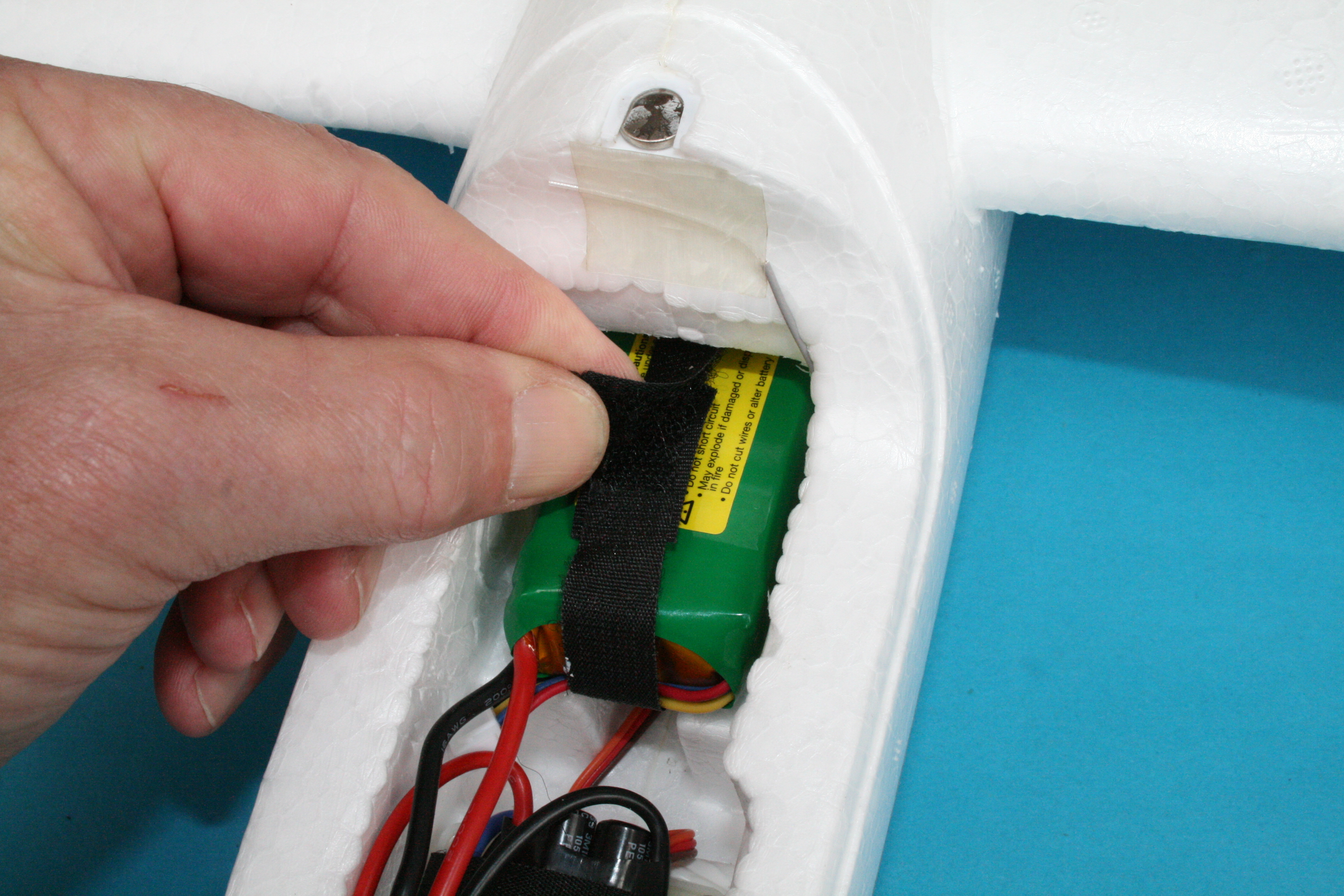 Auf keinen Fall darf mit einer nicht korrekten Schwerpunktlage gestartet werden, ein Absturz mit der Möglichkeit einer Beschädigung des Modells wäre dabei die Folge! Wenn die Lage des Akkus im Rumpf gegeben ist, wird der Akku mittels Klettband festgelegt.