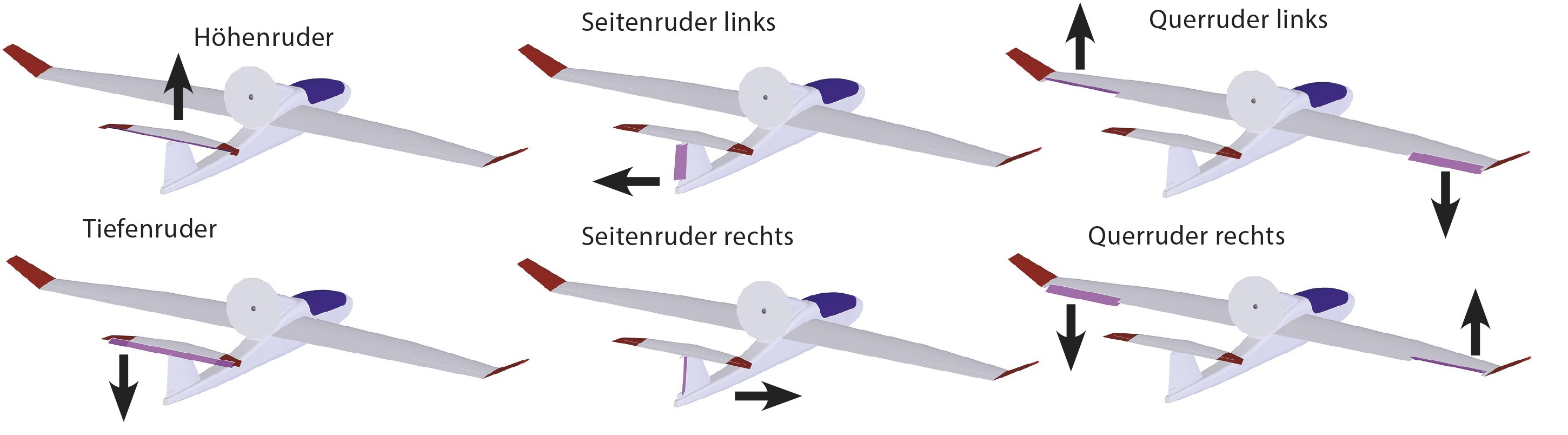 Haben wir die Tests zur Neutralstellung der Ruder absolviert, prüfen wir die Laufrichtung der Servos und damit die Richtigkeit der Ruderausschläge. Die Ruder müssen dabei wie folgt ausschlagen (Modell von hinten betrachtet):