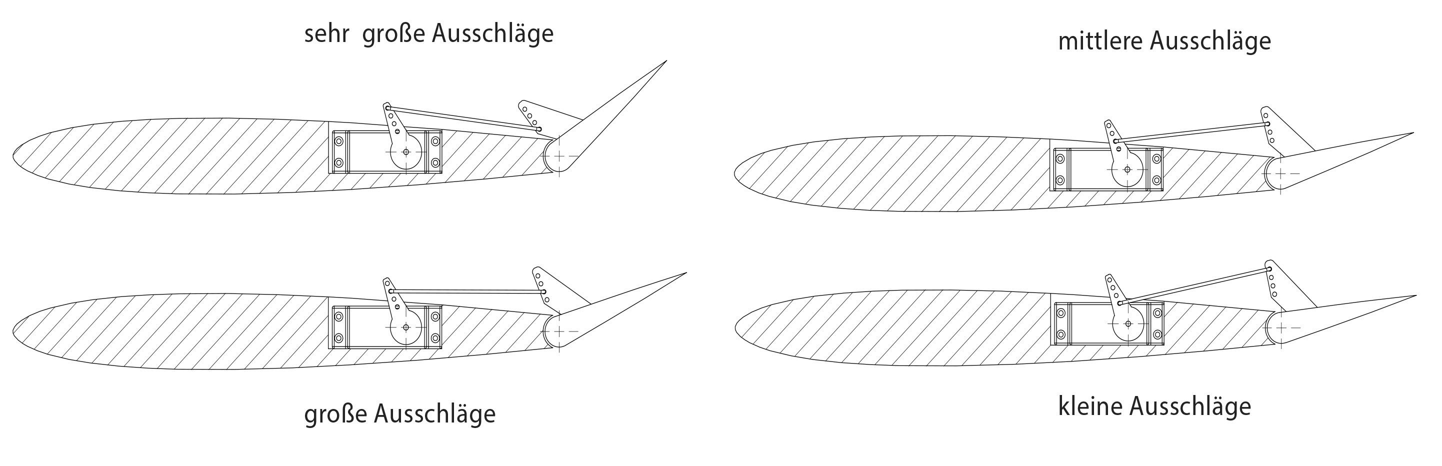 Je weiter außen der Anlenkdraht am Servohebel, bzw. je weiter innen am Ruderhorn eingehängt wird, umso größer wird der Ruderausschlag.