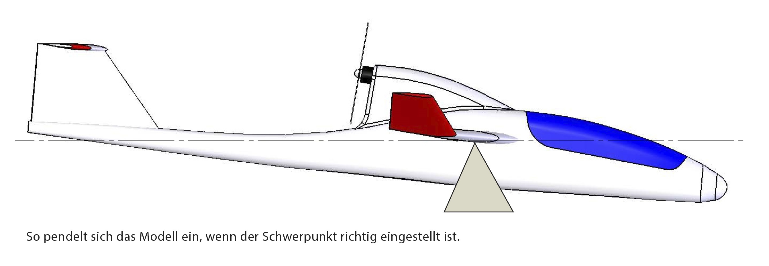 Bei richtiger Schwerpunktlage pendelt sich das Modell mit leicht nach unten hängender Rumpfspitze aus. Es wäre nun Zufall, wenn der Schwerpunkt sofort stimmen würde. Senkt sich das Heck, so muss Gewicht in die Nase verlagert werden. Senkt sich die Nase zu stark, muss Gewicht nach hinten verschoben werden. Grundsätzlich erfolgt das Auswiegen über das Verschieben des Flugakkus. Erst wenn dies ausgereizt ist und sich der Akku nicht mehr weiter verschieben lässt, werden kleine Zusatzgewichte angebracht.