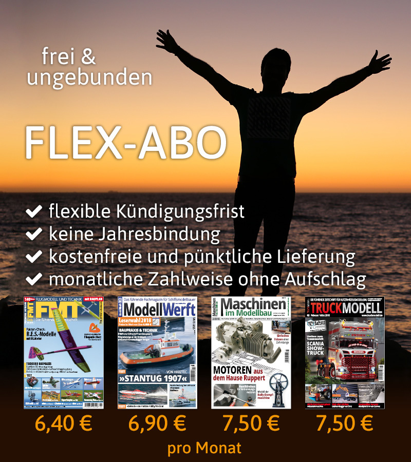 Sie möchten sich nicht binden – und trotzdem Ihre Lieblingszeitschrift im Briefkasten? Das geht! Mit unserem neuen Maschinen im Modellbau Flex-Abo. Ihre Vorteile: flexible Kündigungsfrist, keine Jahresbindung, monatliche Zahlweise ohne Aufschlag, kostenfreie und pünktliche Lieferung. Kündigungsfrist 30 Tage vor Ablauf des Monatsendes, zahlbar monatlich per Lastschrifteinzug zum aktuellen Coverpreis von 7,50 € (Inland) und 9,50 € (Ausland).