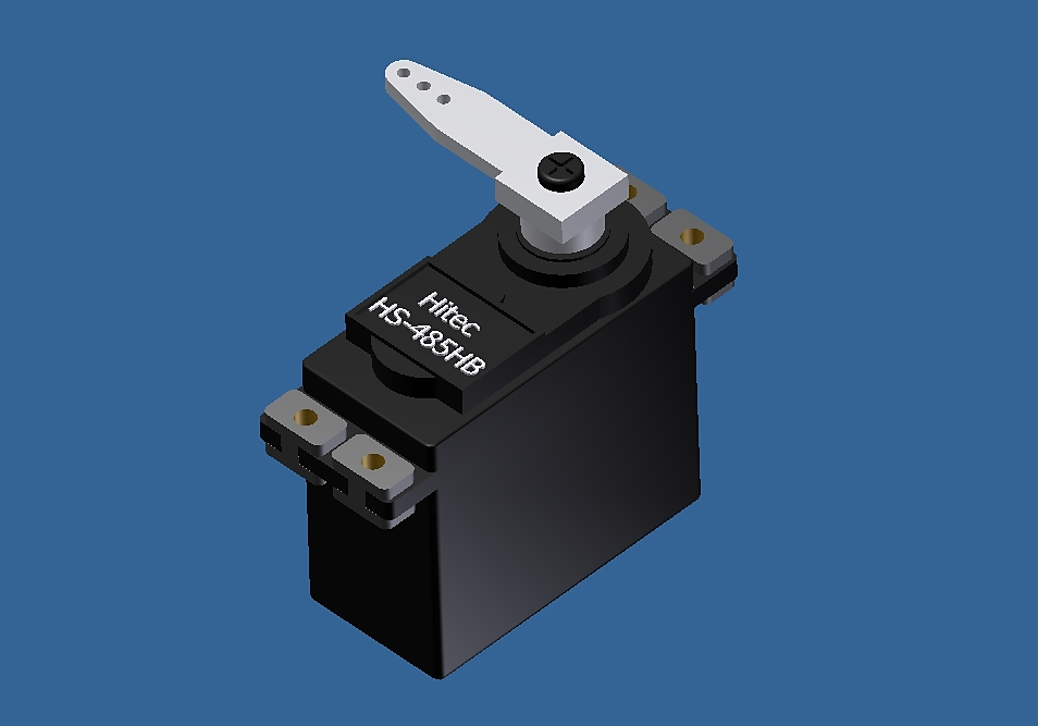 CAD-Datensatz des preiswerten Analog-Servos HS-485HB von Hitec. Technische Daten HS-485HB Analog-Servo: Abmessungen: 39,8 × 19,8 × 38 mm, Gewicht: 45 g, einfach kugelgelagert, Karbonite-Getriebe, Betriebsspannung: 4,8 bis 6,0 V, Stellzeit bei 4,8: 0,22 s/60°, Stellzeit bei 6 V: 0,18 s/60°, Stellmoment bei 4,8 V: 48 Ncm, Stellmoment bei 6 V: 60 Ncm.