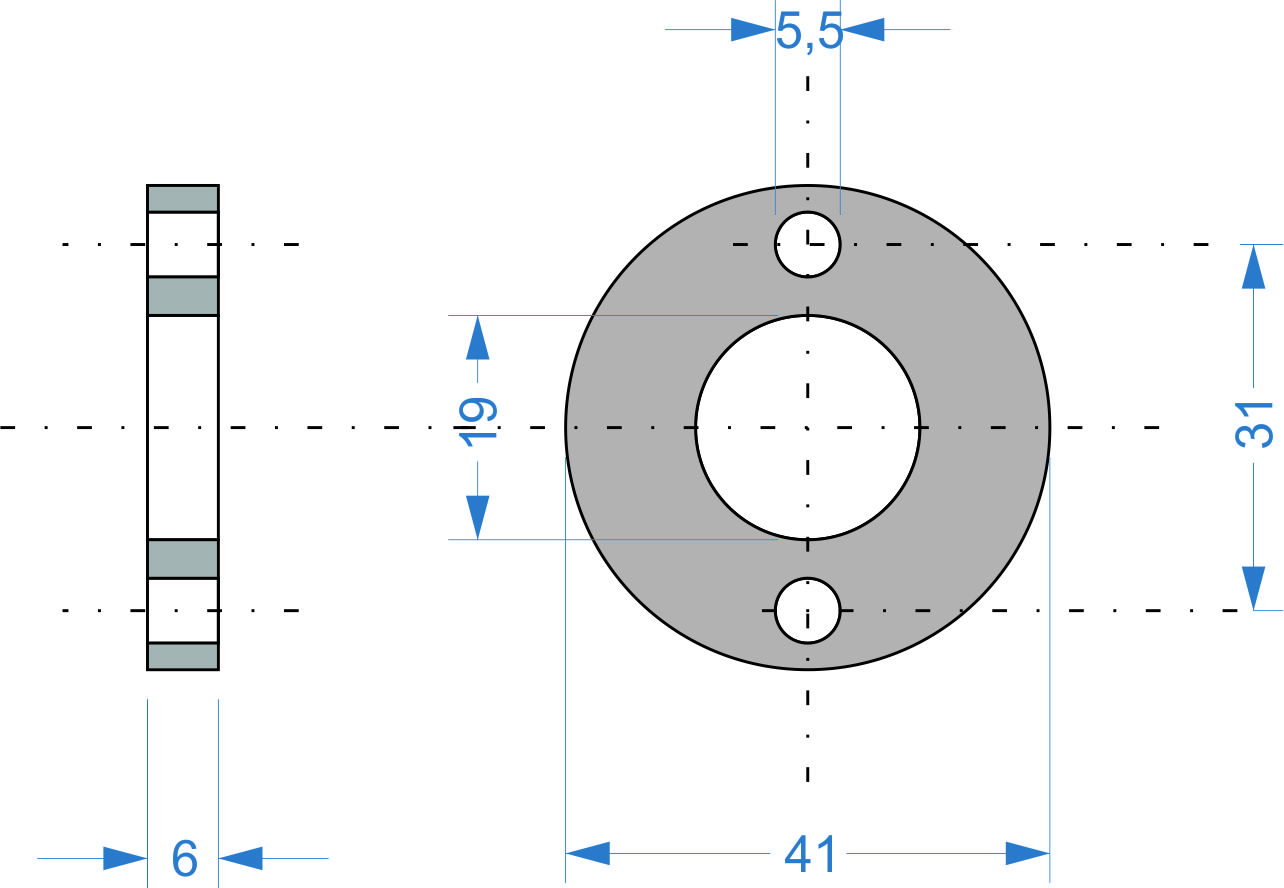 CAD-Datensatz für die Isolierscheibe zwischen Vergaser und Flansch am Benzinmotor, Material GFK/Novasit, für 31-mm-Lochabstand und 19-mm-Durchlass-Durchmesser.