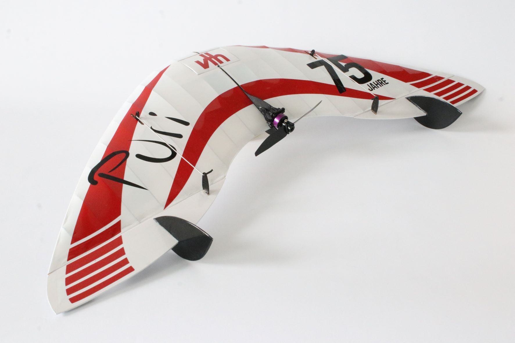 Der von Tim Weißbach konstruierte Puri ist ein variables Spaßgerät für alle Fälle. Der Schwanzlose mit nur 650 mm Spannweite und geteilter Fläche lässt sich als Segler, mit Impeller-Antrieb oder als Propeller-Version mit diversen Motoren fliegen. Darüber hinaus bietet sich das Modell auch für alternative Antriebs-Optionen wie Raketenmotoren, Gummimotoren oder andere skurrile Ideen an. Den Bausatz des Modells gibt's im VTH-Shop, das Jubiläums-Design (Corel-Datei) und den Puri-Schriftzug (DXF-Datei) gibt's hier zum Download. Auf die gewünschte Größe kann der Schriftzug selbst skaliert werden.