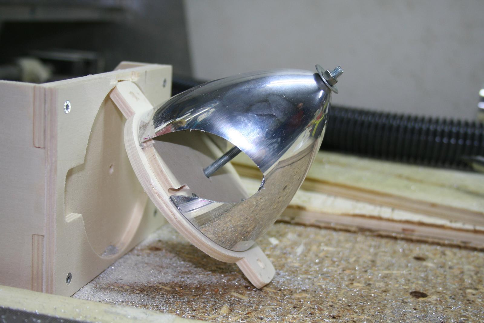 Die CAD-Daten zeigen eine Halterung für Spinnerkappen und eine Beispieldatei für die Ausschnitte einer Dreiblattluftschraube. Mit diesen ist es möglich, die Luftschrauben-Ausschnitte in der Spinnerkappe passgenau auf einer Portalfräse zu fertigen.