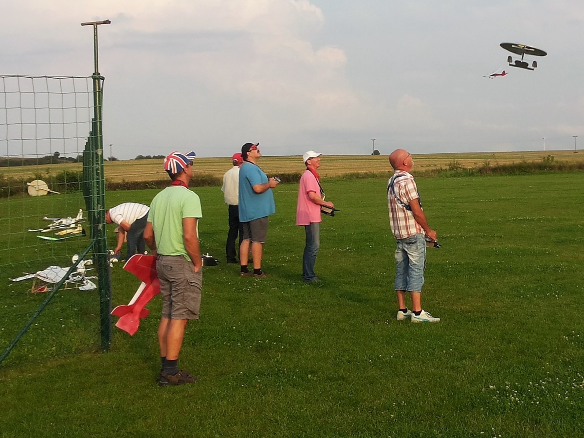 Nun stand die Flyerparade an, welche die Grundlage für eine Wertung war. Die Piloten gaben alles. Rauf und Rum, nach Links und Rechts oder knapp über die Grasnarbe! Enterprice jagte Taucher, Kunstflugmanöver wohin man nur schaute! Aufmerksamkeit weckten aber auch die Flieger, die fast still im aufziehenden Abendhimmel standen und gelegentlich ganz gemütliche ihre Bahnen zogen und mit markanten Farbeindrücken ihren Modellen einen gewissen Glanz einhauchten.