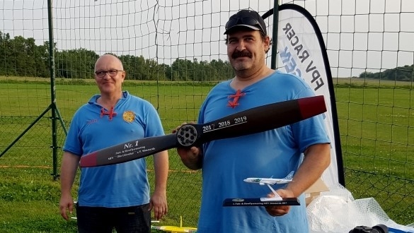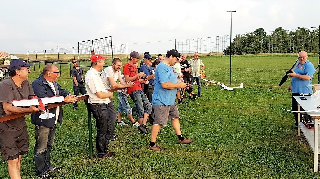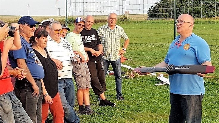 Da dieses Event sich jährlich wiederholen soll, stiftete der Vereinsvorstand einen hochwertigen Wanderpokal in Form einer Luftschraube. Sichtlich überrascht nahm Michael Rongen aus unserem Verein seinen Propeller in Empfang. Michael ist eigentlich noch ein Fluganfänger und hat vor wenigen Tagen sein Siegermodell „Slowly“ nach einem FMT-Bauplan mit 3 mm Depron selbst gebaut. Bisher hatte er nur Erfahrungen mit einem Easy Star.