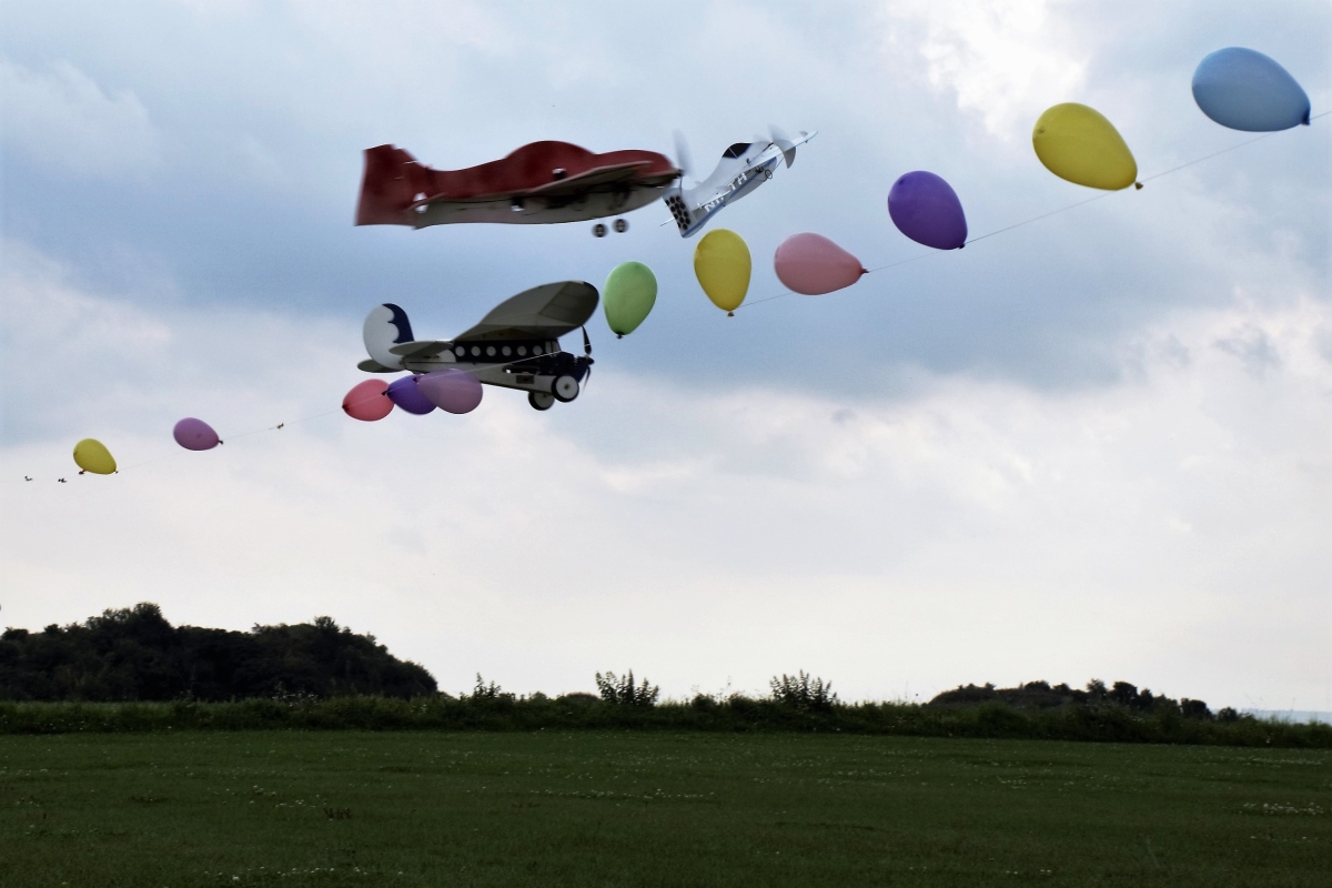 Die sich anschließende „Fliegende Tombola“ lockte dann auch den letzten Piloten auf den Platz und alle Teilnehmer versuchten mit allerlei Tricks und Flugvermögen die mit Lospreisen gefüllten Luftballons von der Leine zu lösen. Wer hätte im Vorfeld gedacht, dass diese Aktion das sogenannte "Kind im Manne" weckt und ein Lacher dem anderen folgte.