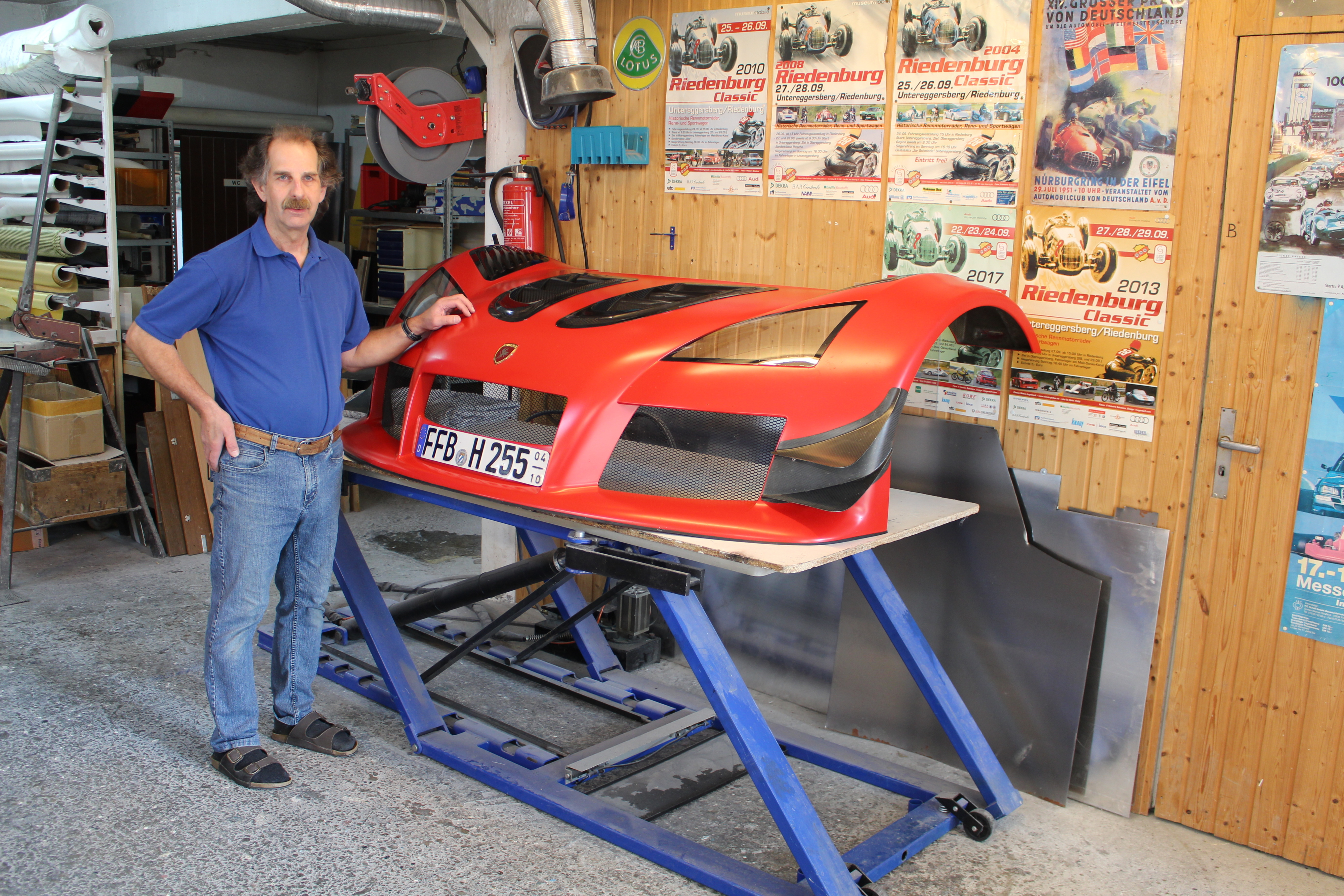 Alois vor der vorderen Haube eines Supersportwagens. Ein nur Insidern bekannter „Apollo“, von dem nur 35 Stück gebaut wurden. Und sollte bei einem Rennen ein Missgeschick passieren, Alois macht’s wieder heile.
