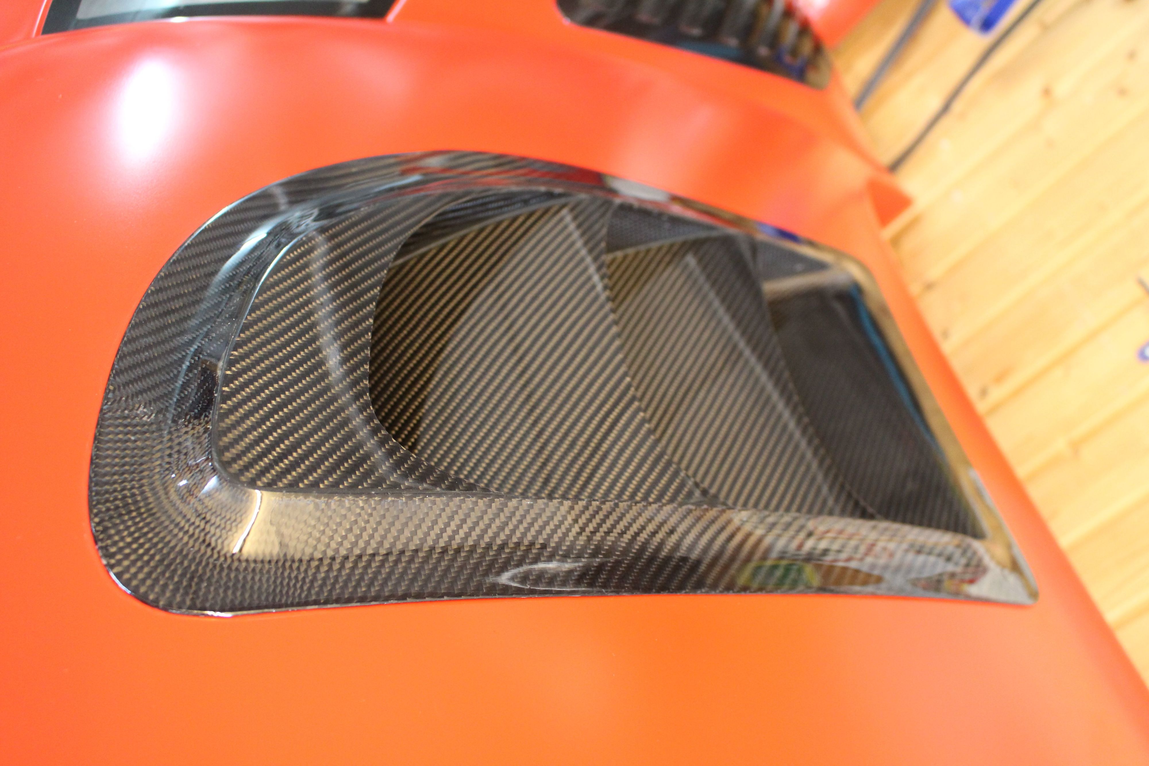 Dieser Luftauslass ist nicht Serie. Der Besitzer dieses Wagens ließ einen größeren Kühler einbauen und das mehr an Abluft musste ja irgendwie wieder raus. Alois fertigte diesen Auslass als Einzelstücke, aber wenn schon, dann bitte in Sichtkohle!