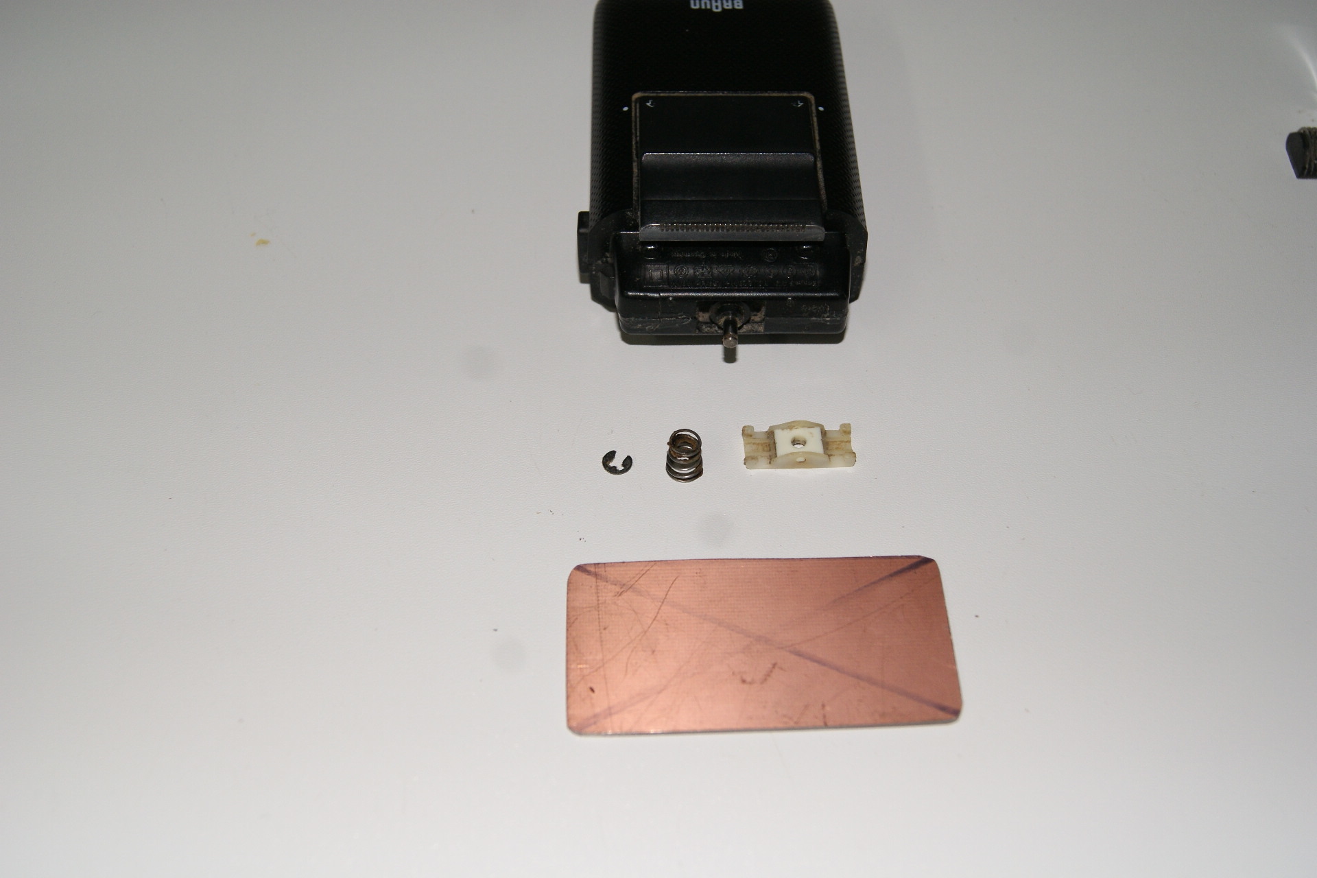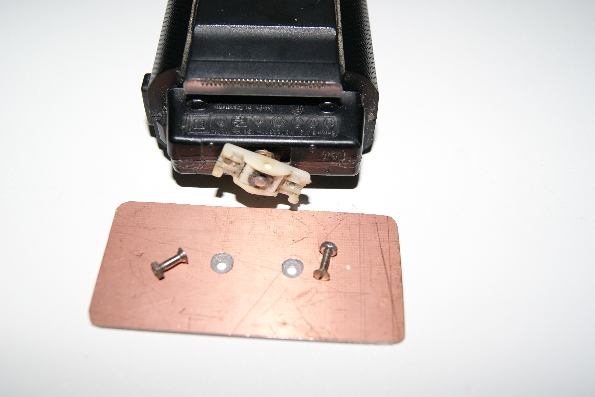 Folgende Bauanleitung bezieht sich auf einen Braun-Netzrasierer, wobei das Umbauprinzip bei allen Schwinggeräten nahezu identisch ist. Wir beginnen mit dem Abnehmen des Scherfolienkopfes und dem Messerblock, wie es auch beim Reinigen des Rasierers geschieht.