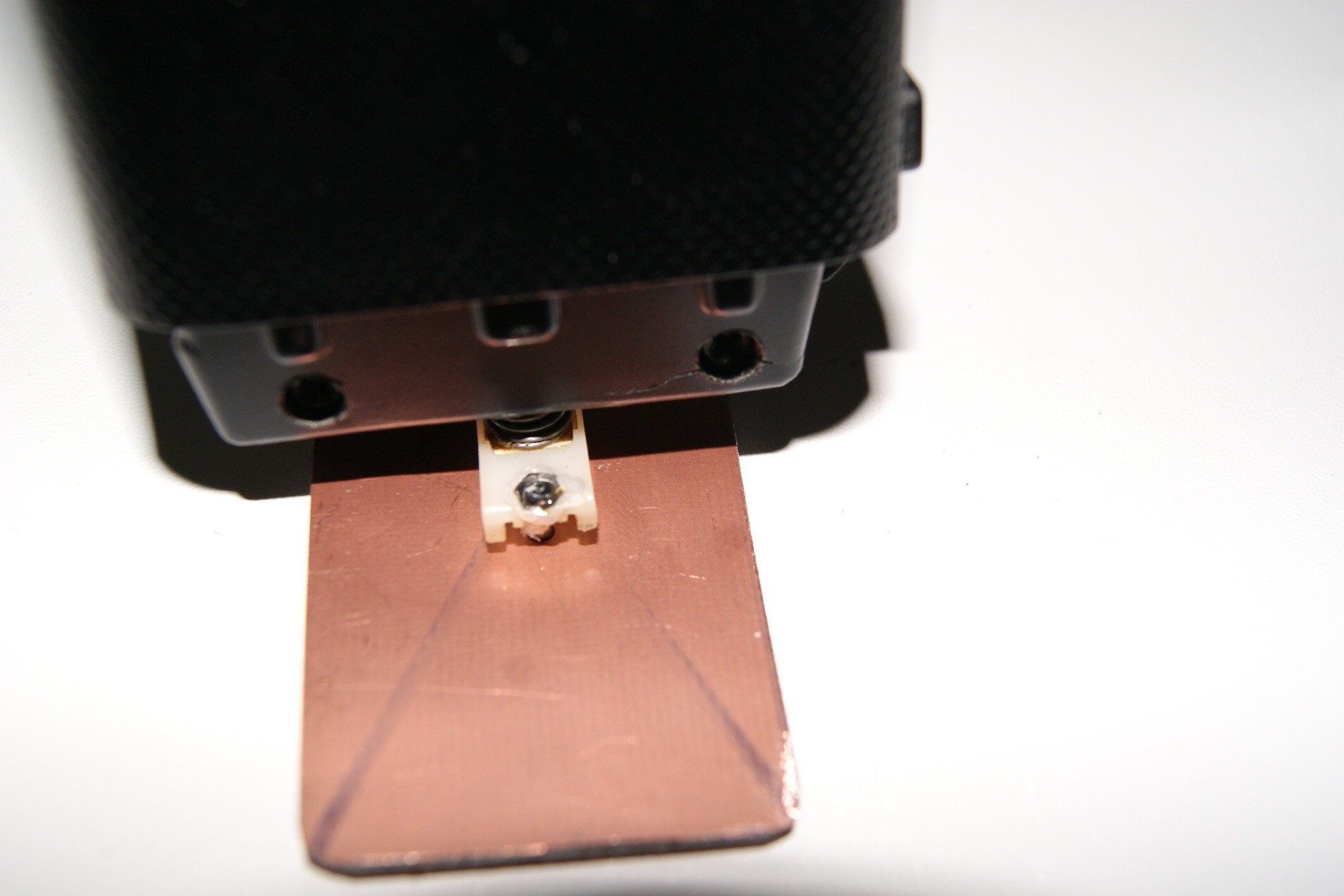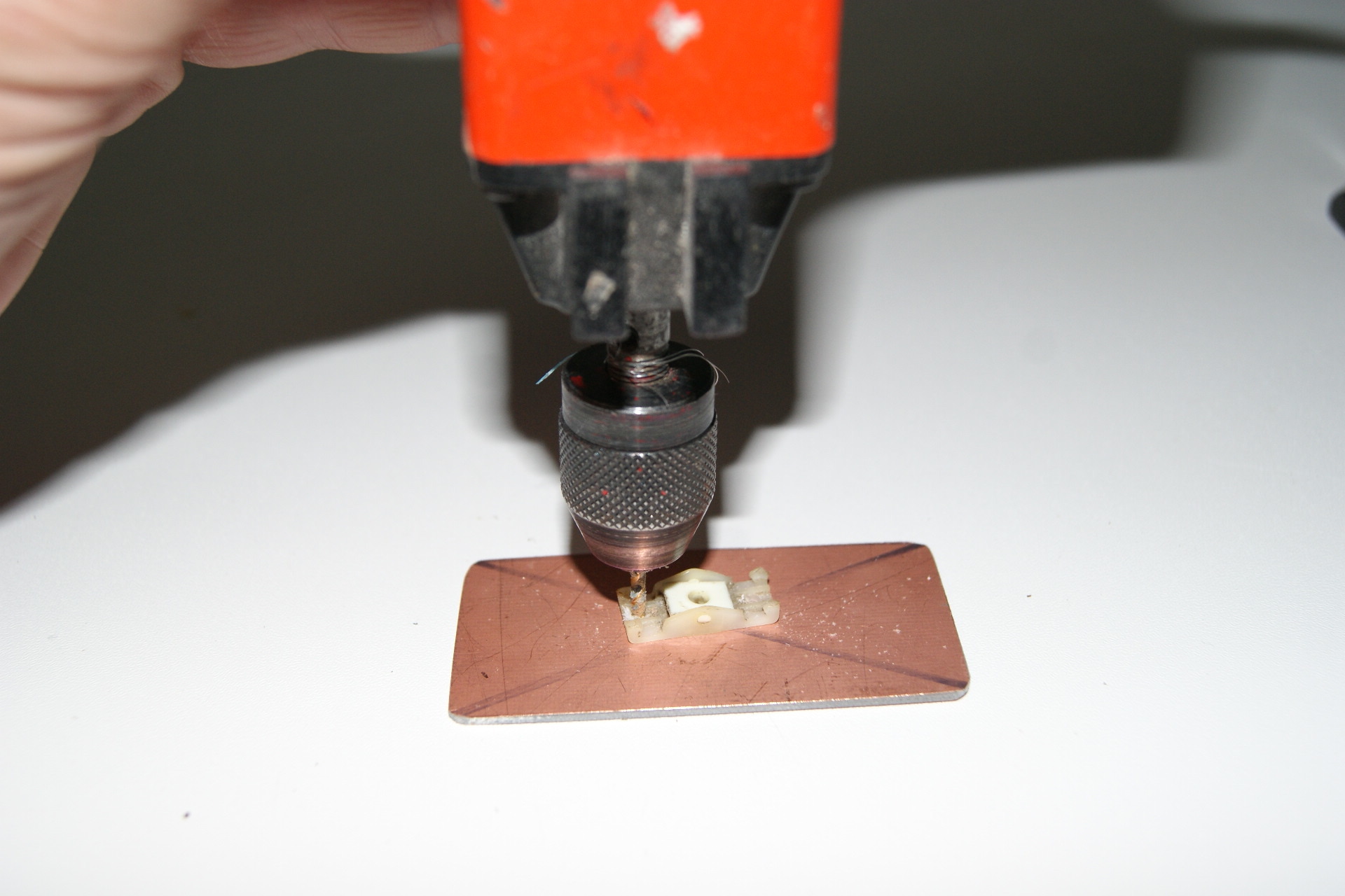 Um die Schleifplatte befestigen zu können, muss der Kunststoffhalter demontiert werden. Bei unserem Braun-Gerät wird diese durch einen sogenannten Seegerring gehalten. Achtung „Feder“ - das Element steht unter mechanischer Spannung und wenn man nicht aufpasst, hüpft das Teil quer durch die Werkstatt und man muss lange suchen. Nun wird die Mitte auf der Trägerplatte angezeichnet und in beide Elemente 2 mm Löcher gebohrt. Da überstehende Schraubenköpfe unschöne Muster ergeben, senken wir die Bohrungen an. Dann wählen wir zwei Linsenkopfschrauben mit Gegenmutter aus und längen diese entsprechend ab. Nun werden Kunststoffhalter und Trägerplatte verschraubt und mit Sicherungslack gesichert. Nach dem Trocknen kann ein erster kurzer Probelauf stattfinden. Da die Platte noch lose an der Verbindung hängt, vibriert sie klappernd um sich.
