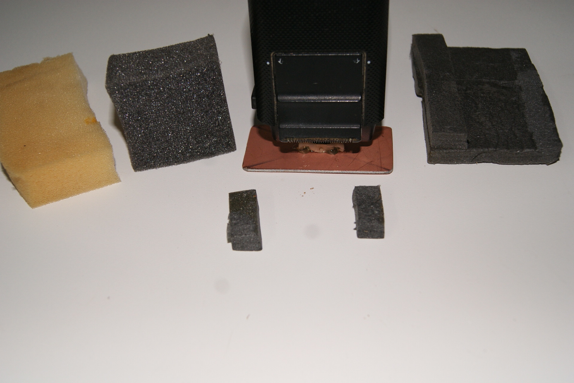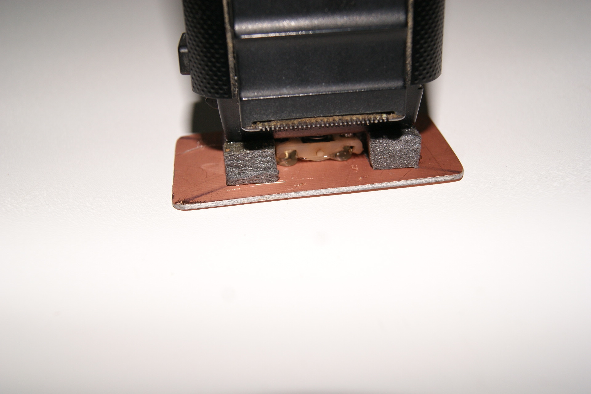 Für die antriebsschwächeren Akkugeräte eignet sich der weichere Normalschaum, während die starken Netzgeräte mit festerem Schaum gute Ergebnisse brachten. Zwei Streifen mit ca. 10x20 mm werden zwischen Gerät und Platte mit Kleber fixiert und übernehmen erfolgreich die Verkipp- und Verdrehsicherung. Nun kann man das Gerät zu einem längeren Testlauf starten und prüfen, ob alle Verbindungen den Vibrationen standhalten.
