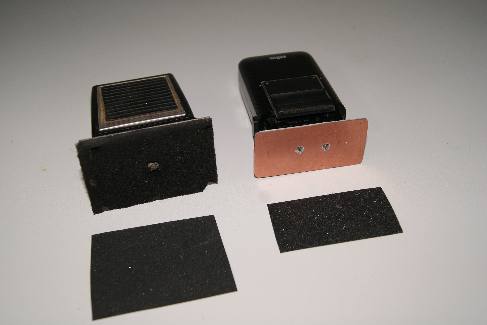 Die Aufbringung des Schleifpapiers erfolgt mit doppelseitigem Klebeband. Ich habe zwei Schleifer gebaut: Nr. 1 fürs Gröbere mit dem Schleifpapier direkt auf der Platte, Nr. 2 fürs Feinere. Hier liegt ein ca. 3 mm dünner Schaumstoff zwischen Platte und Schleifpapier (siehe Eingangsfoto) Der „Stärkere“ wird für das Schleifen glatter Flächen mit höherem Abtrag genutzt. Der „Feinmotoriker“ kommt für den Schliff an empfindlichen und gekrümmten Flächen zum Einsatz