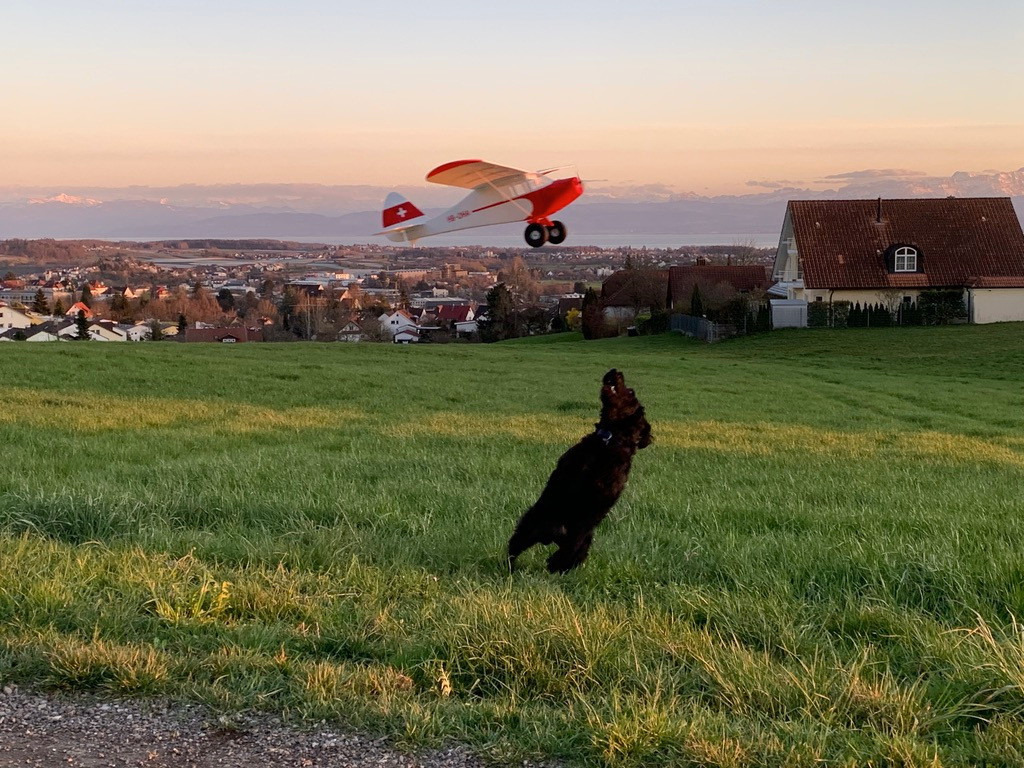 Unser Autor Jörg Pfister hat uns neben dieser phänomenalen Aussicht auf den Bodensee und die Alpen folgende Zeilen gesendet: „Bei mir kommen gerade vermehrt Modelle zum Einsatz, die man problemlos auf der nächsten einsamen Wiese fliegen kann. Hier im Einsatz meine Piper Vagabond XL von Scale-Parkflyer mit einem Abfluggewicht von nur 400 g bei 1,4 m Spannweite oder meine UMX Timber von E-flite. Mein Hund liebt es, Flugzeuge zu verfolgen oder mit dem Flugzeug um die Wette zu laufen. Das perfekte Training für den Hund und Spaß für das Herrchen. Bei der Landung sitzt er vor dem Modell und bewacht es - ohne es zu beschädigen.