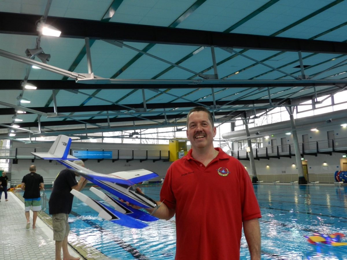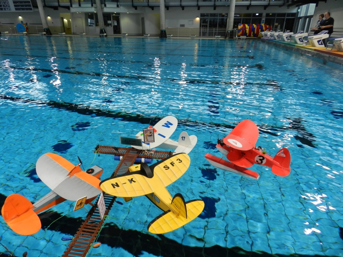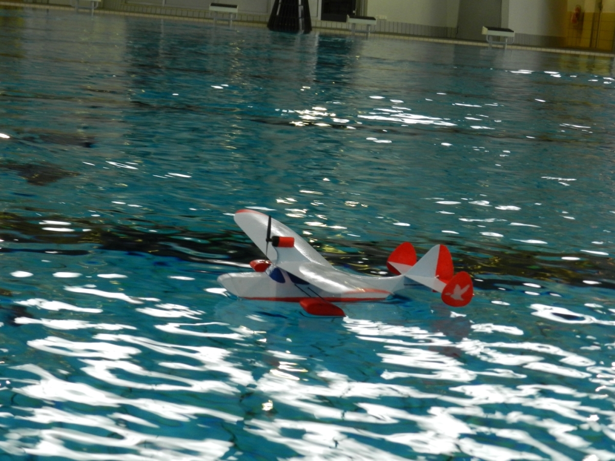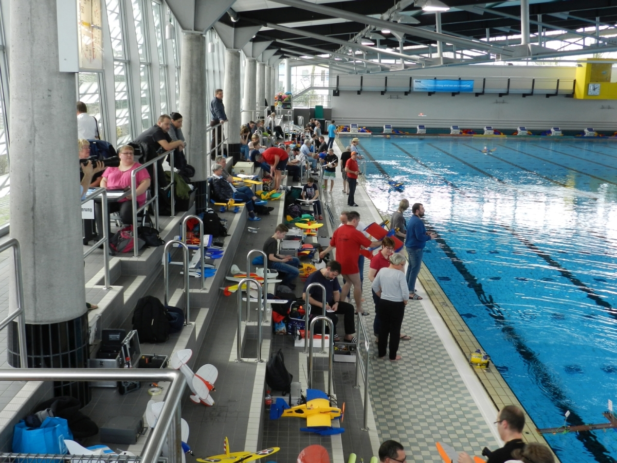 Am 25. Februar war es dann soweit, der Verein hatte zum 1. WIW (Wuppertaler-Indoor-Wasserfliegen) eingeladen. Das Schwimmbecken mit 50×25 m bietet reichlich Platz und Flugmöglichkeit. Über 40 Piloten waren nahezu aus dem gesamten Bundesgebiet angereist, drei sogar aus Belgien. Ein Großteil der rund 100 mitgebrachten Modelle wurde extra für diese Veranstaltung gebaut oder für den Wasserflug mit Schwimmern ausgerüstet. Sehr beliebt war hier zum Beispiel der Magnum Reloaded. Und rund 15 mal war das Bauplanmodell Jupiter Duck vertreten, ein einfach und leicht aufgebautes Flugboot von Thomas Buchwald mit hervorragenden Eigenschaften auf dem Wasser und in der Luft. Micheal Rützel und Stefan Hesse begeisterten mit ihren Cabbys, einem FMT-Downloadplanmodell.