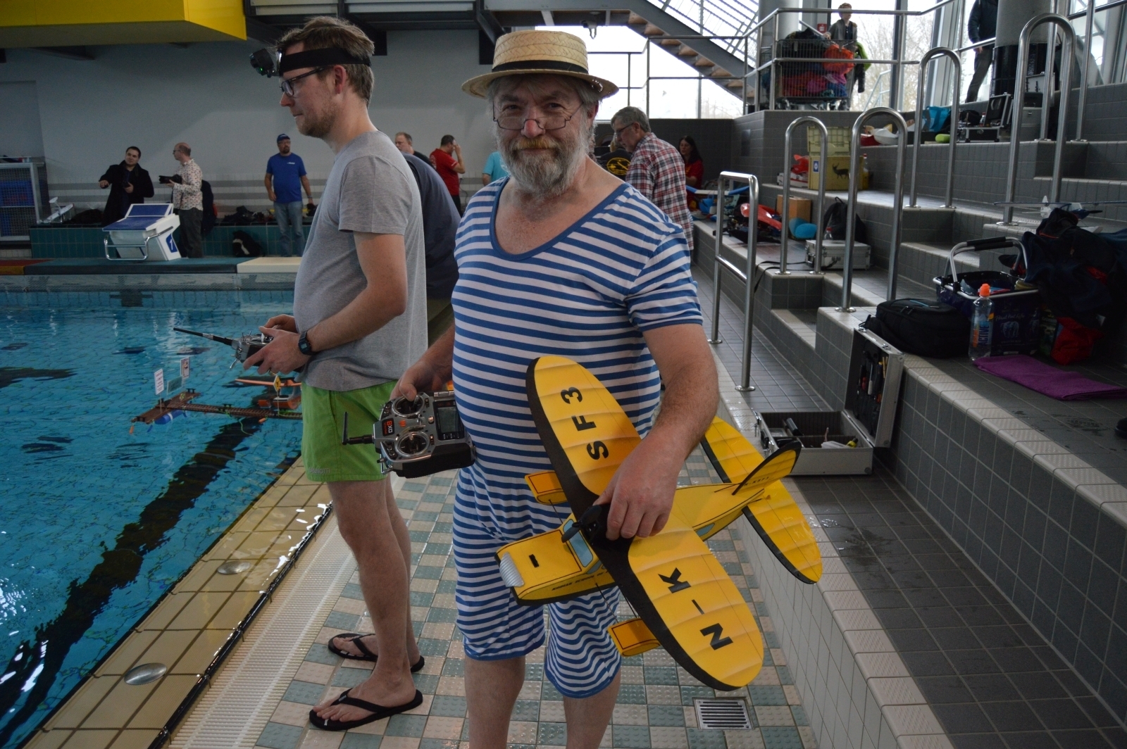 Wasserflieger müssen auch irgendwo anlegen können, dazu hatte sich Stephan Brehm was einfallen lassen und kurzerhand einen Landungssteg gebastelt und mit nach Wuppertal gebracht. Tolle Eindrücke vom Indoor-Wasserfliegen sind auch in seinem und Michael Rützels Video zu sehen. Michael hatte sogar seinen Taucheranzug und eine Unterwasserkamera dabei und war damit öfter im Schwimmbecken unterwegs. Das Treiben wurde von Sven Anacker als Sprecher kurzweilig für die ca. 200 Besucher kommentiert. Für die Verpflegung der Piloten und Zuschauer hatte die Stammtischmannschaft einen Imbisswagen organisiert und vor der Schwimmhalle postiert.