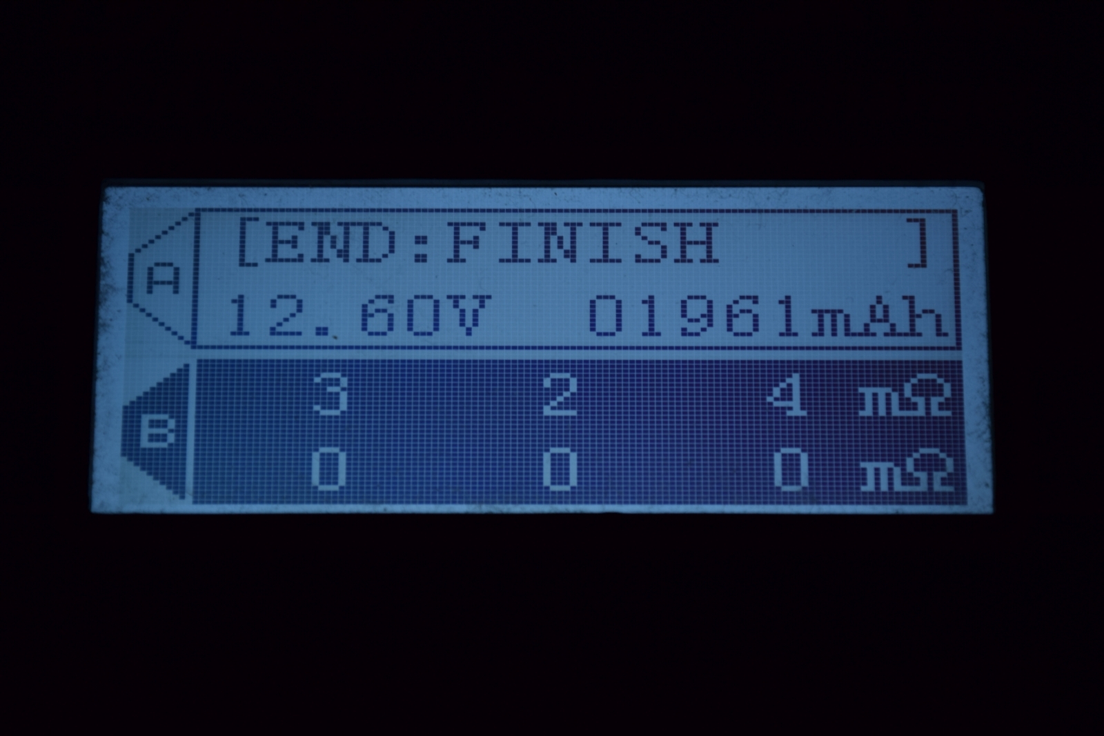 Ein weiterer Test betrifft eben diese Restkapazität: Ich entlade den LiPo mit dem in meinem Ladegerät zur Verfügung stehenden Entladeprogramm (das bis maximal 90% entlädt). Dann lade ich ganz normal mit 1C. Hat er nun deutlich weniger als 80% seiner angegebenen Kapazität geladen, fliegt er raus.