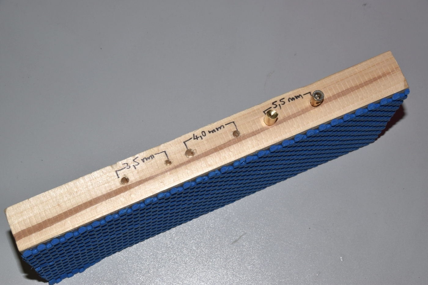 Das Restebrett wird an der Seite einfach mit den nötigen Bohrungen versehen. Ich benutze drei Steckersysteme, daher habe ich je ein Loch für den Stecker und eines für die Buchse gebohrt. Die nötigen Bohr-Durchmesser für meine drei Systeme habe ich hier aufgelistet. Wer andere hat, muss entsprechend anpassen. Für die Stecker ist das Bohrmaß klar, für die Buchsen müssen die Löcher entsprechend größer gebohrt werden: