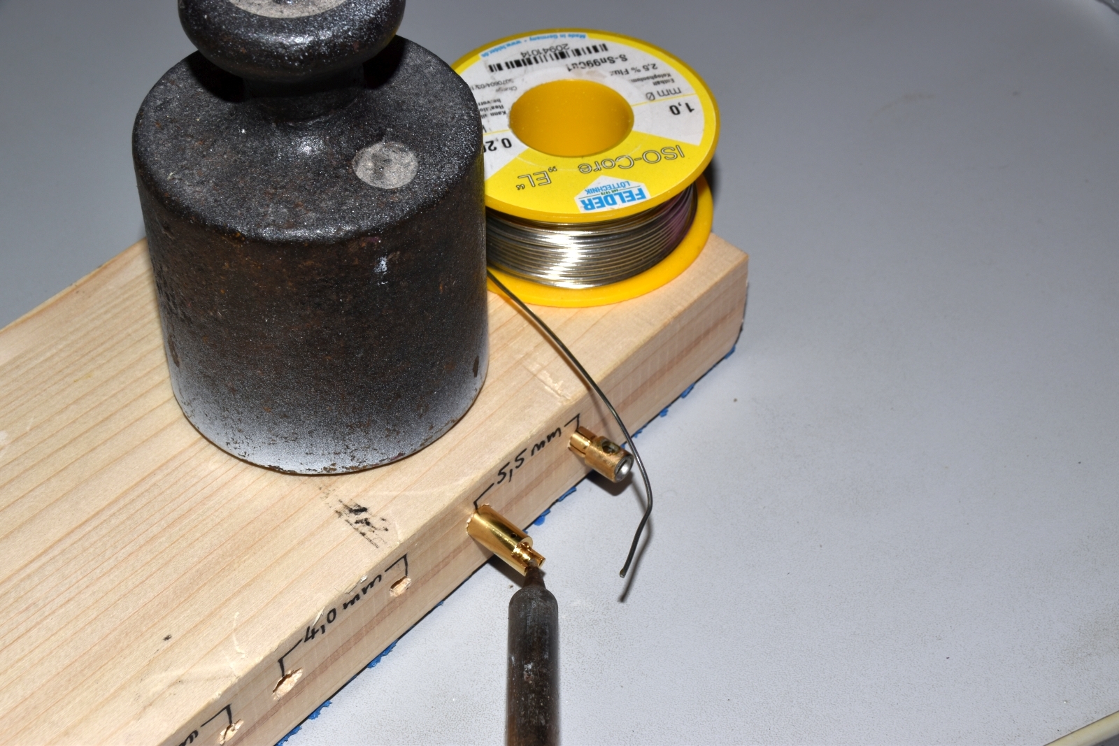 Das Brettchen wird dann auf der Unterseite mit Doppelklebeband versehen und ein Stück Antirutschmatte aufgebracht. Zum Löten lege ich einfach ein Gewicht auf das Brettchen. Dann rutscht da nichts mehr und man hat beide Hände frei zum Löten. Die Bohrungen sind am Brettchen seitlich angebracht, damit auf keinen Fall Lötzinn in die Stecker gelangen kann. Das Holz führt kaum Wärme ab. Das bedeutet, dass die ganze Lötkolbenpower in die Lötstelle fließt und nicht vom Metall zügig abgeführt wird. Kurzschlüsse sind kaum möglich - Holz leitet den Strom nicht. Mit der Zeit werden die Bohrlöcher durch die Hitze wohl etwas größer. Dann bohrt man halt neue. Das war‘s. Einfacher geht nicht, praktischer aber auch nicht. Und billiger sowieso nicht. Nur traurig, dass ich dafür 30 Jahre gebraucht habe! Gibt es da draußen ausgeklügeltere Löthilfen? Würde mich interessieren.