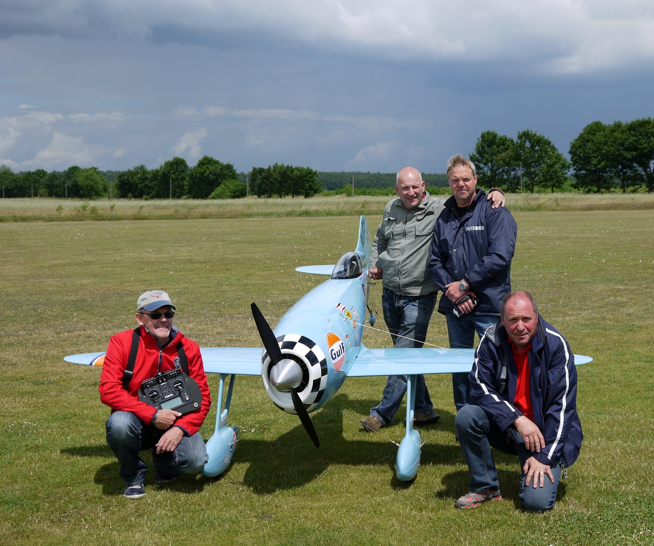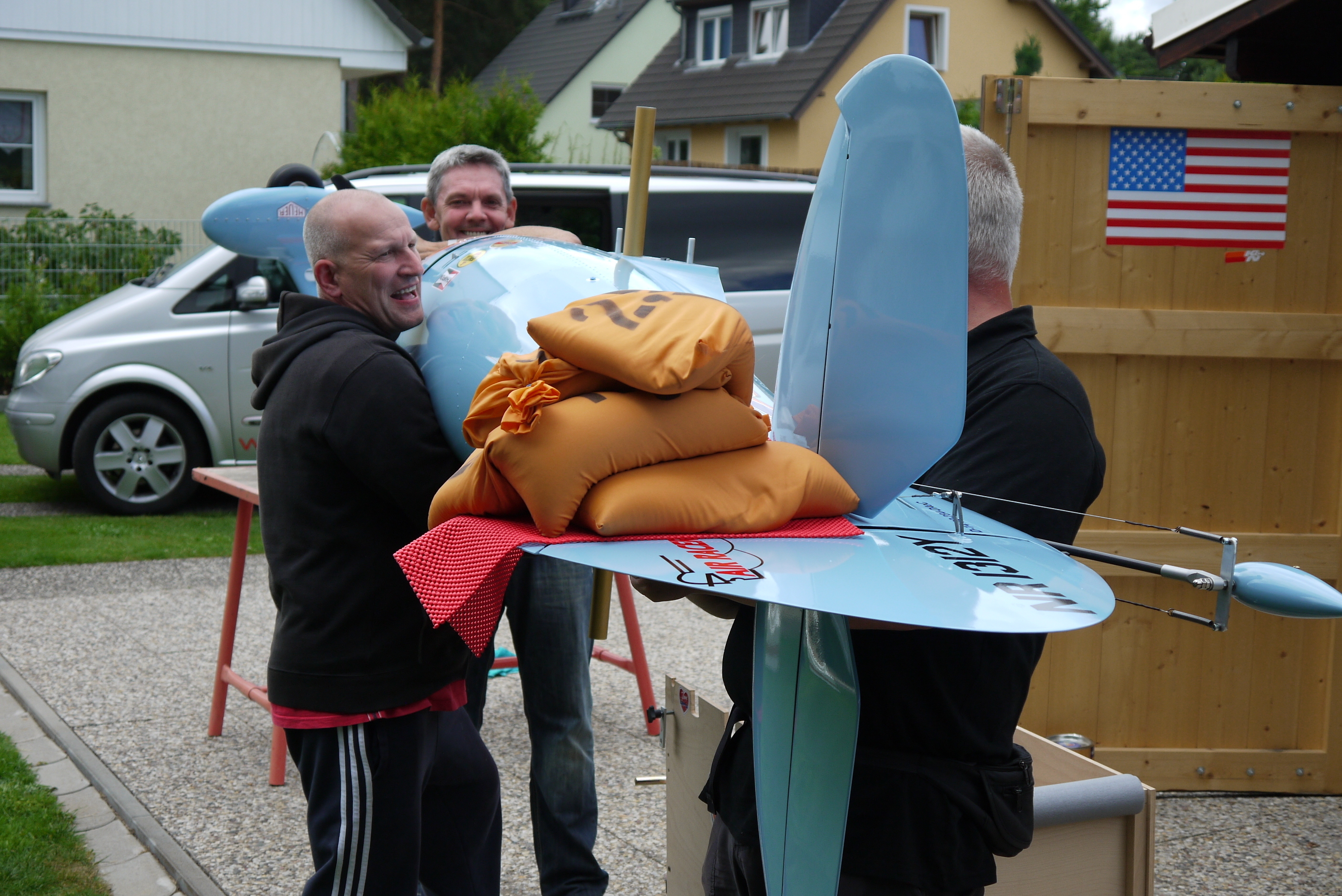 Im Juni 2014 fand die Abnahme der Maschine auf dem wunderschönen Modellflugplatz des BVM Ragow statt. Auf dem gepflegten Rasen steht also ein Modell mit 3 m Spannweite, 3 m Rumpflänge, besagtem Moki 300 und einer max. Abflugmasse von 32,50 kg. Alle Ruderklappen werden von Futaba-BLS-172-HV-Servos bewegt, die über sehr stabile Anlenkungen verbunden sind. Auch bei der RC-Anlage vertraut Frank auf Futaba mit Bus-System. Wir erinnern uns, dass es ein Rennflugzeug ist und diese eben schnell fliegen. Vom Physikunterricht (ersatzweise aus dem Internet) wissen wir noch, dass die kinetische Energie das Produkt aus halber Masse und dem Quadrat der Geschwindigkeit ist.