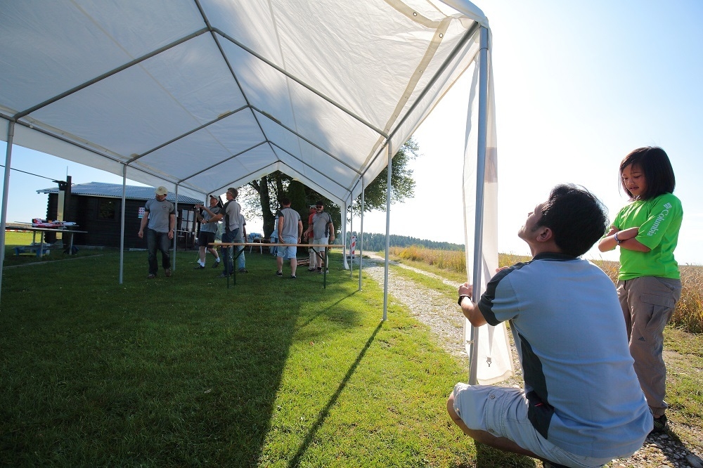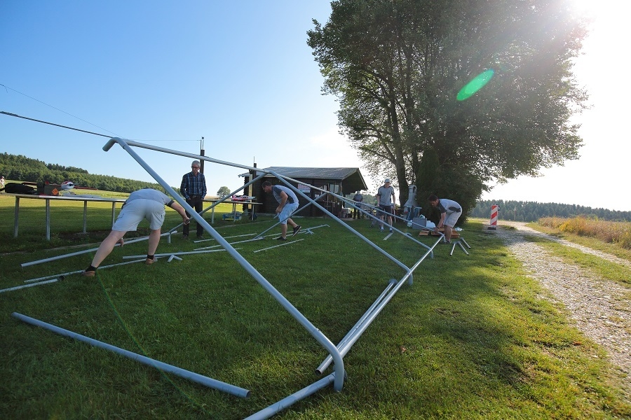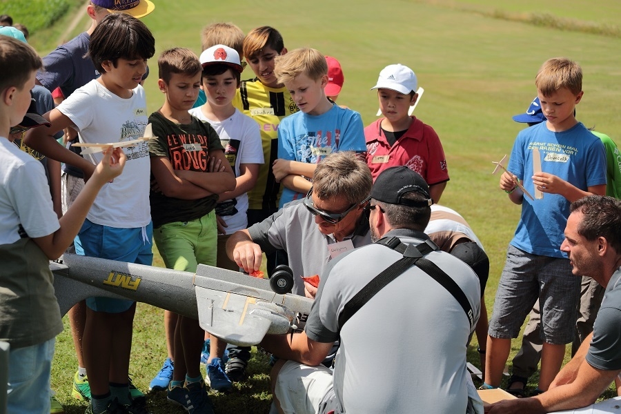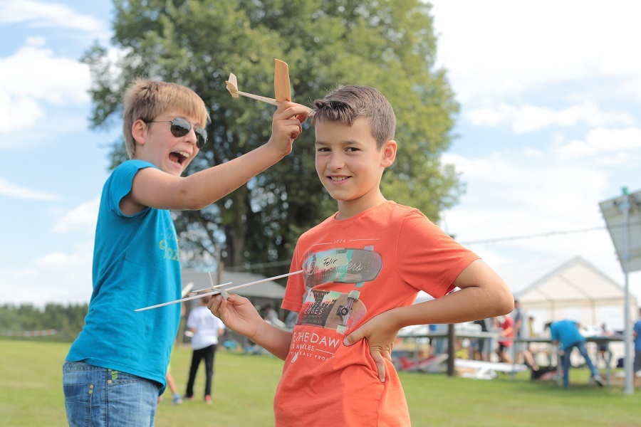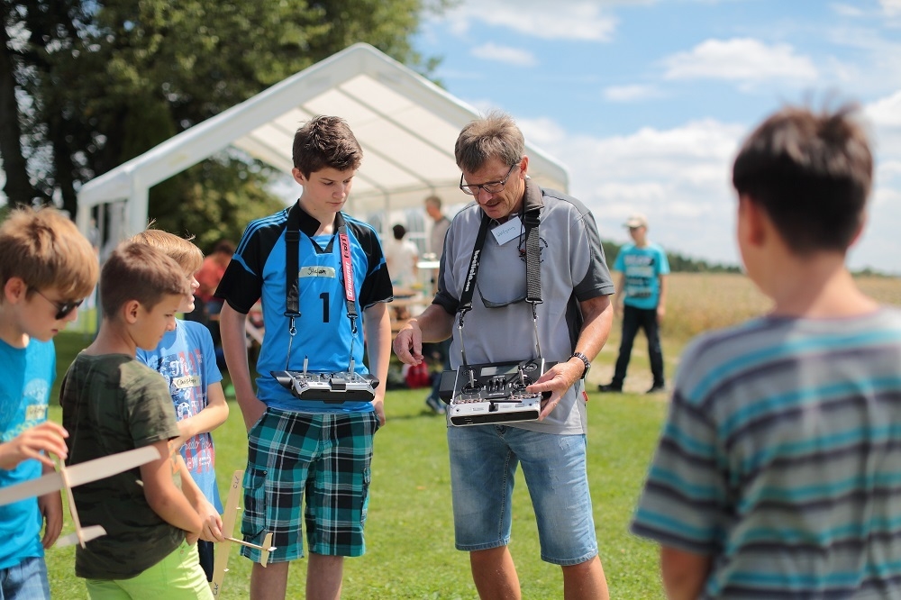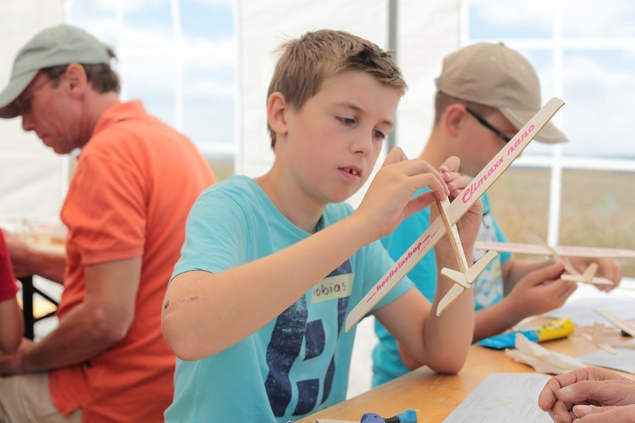 Kleine Gruppen ermöglichten ein häufiges Fliegen und so stellten sich bereits nach kurzer Zeit die ersten Erfolge ein. Waren die ersten Flüge noch sehr zappelig, so hatten die jungen Piloten im Folgenden bald den richten Dreh heraus. Während die einen flogen, konnte der andere Teil der Jugendlichen seine ersten Bauerfahrungen erleben. In einem eigens aufgebautem Zelt wurde unter Anleitung einiger Vereinsmitglieder einfache Balsa-Gleiter zusammen gebaut. Viele verpassten ihrem Flieger noch ein individuelles Outfit mit Buntstiften, bevor es anschließend zum Einfliegen ging.