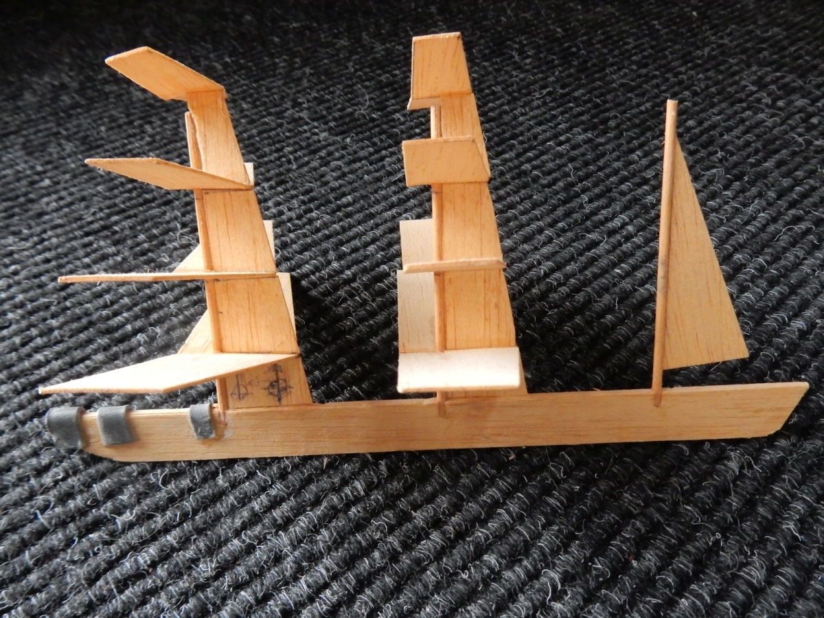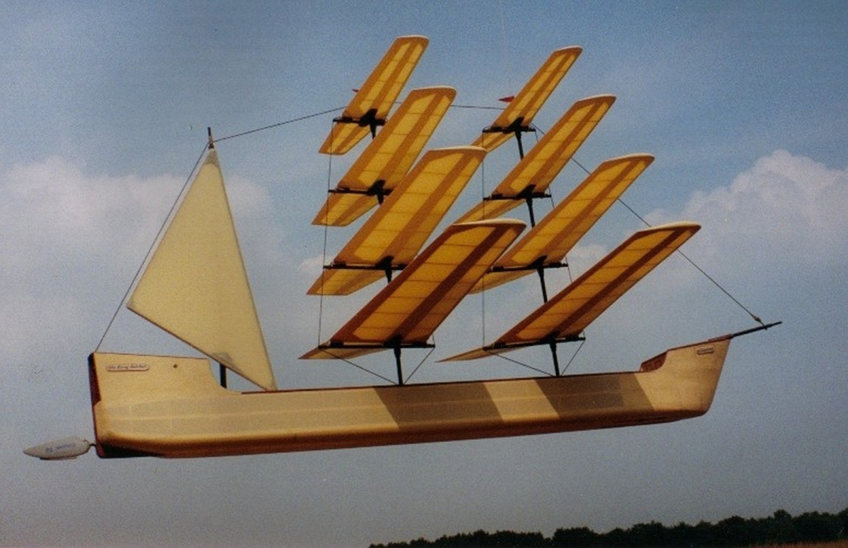 Ein anderes Beispiel ist mein fliegendes Schiff, ein Dreimaster mit insgesamt acht Flügeln. Natürlich gibt's auch einen Propeller hinten für den Antrieb. Die kleine Version flog sehr gut, die große hat jedoch Probleme mit der lange CFK-Antriebsachse, die schnell bricht. Auch ist die Richtungsstabilität eher problematisch. Also nur teilweise erfolgreich.