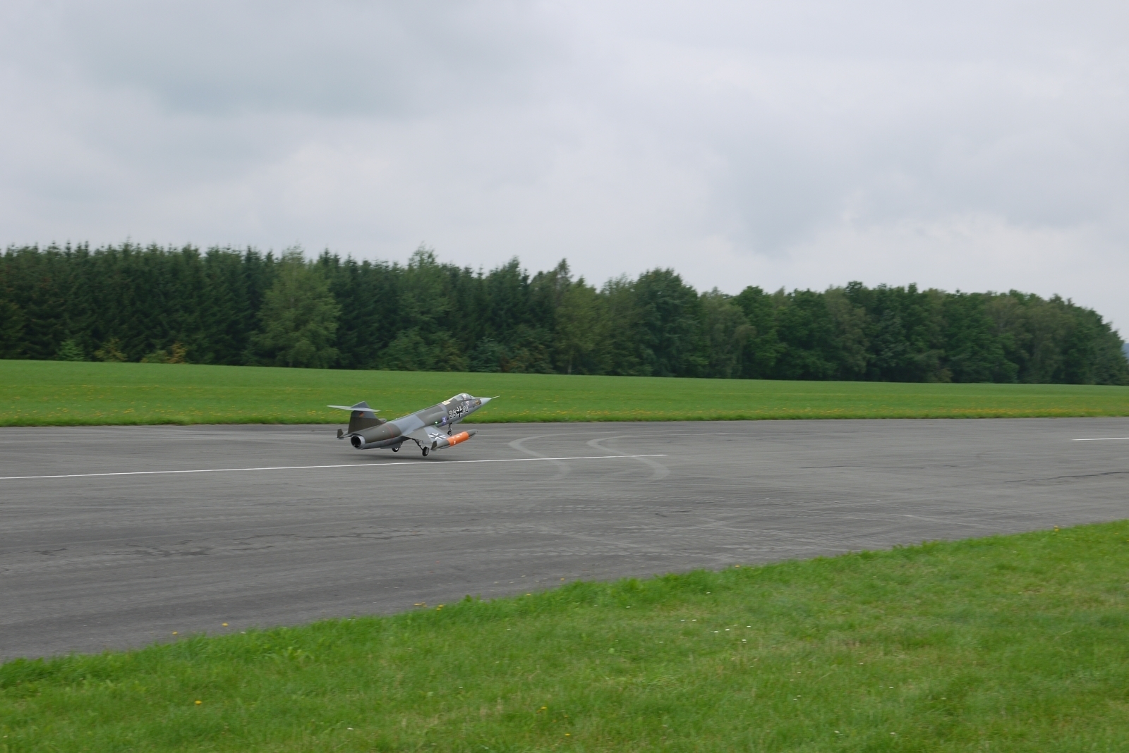 Nach dem positiv verlaufenen Abarbeiten aller Vorprüfungen rollt die F-104 zum Startpunkt. Das Triebwerk fährt zügig hoch und beschleunigt die Maschine rasch auf die erforderliche Abhebegeschwindigkeit. Problemlos zieht der Pilot sie hoch und liefert nach einigen Eingewöhnungsrunden das vorher festgelegte Flugprogramm ab. Die Maschine liegt satt in der Luft und folgt unmittelbar den Ausschlägen der kleinen Ruderklappen. Das ganz besondere Flugbild des Starfighters mit seinem langen Rumpf, den Stummelflügeln und der negativen V-Form ist beeindruckend und der kraftvolle Sound des Triebwerkes unterstreicht das noch. Den Abschluss bildet dann die vorbildgetreue Landung mit hohem Anstellwinkel – und da ist es ganz stark wieder, dieses Gänsehaut-Gefühl…
